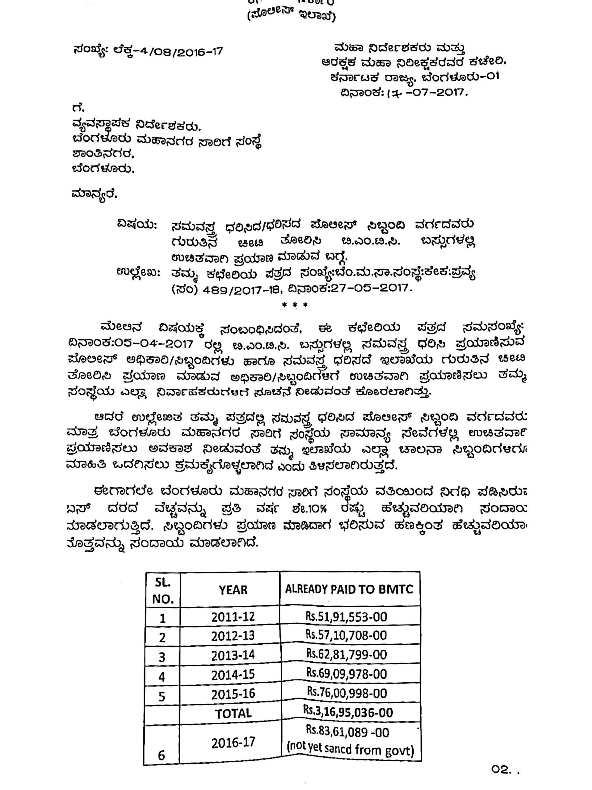 ಆದರೆ ಉಲ್ಲೇಖಿತ ತಮ್ಮ ಪತ್ರದಲ್ಲಿ ಸಮವಸ್ತ್ರ ಧರಿಸಿದ ಪೊಲೀಸ್ ಸಿಬ್ಬಂದಿ ವರ್ಗದವರು ಮಾತ್ರ ಬೆಂಗಳೂರು ಮಹಾನಗರ ಸಾರಿಗೆ ಸಂಸ್ಥೆಯ ಸಾಮಾನ್ಯ ಸೇವೆಗಳಲ್ಲಿ ಉಚಿತವಾ ಪ್ರಯಾಣಿಸಲು ಅವಕಾಶ ನೀಡುವಂತೆ ತಮ್ಮ ಇಲಾಖೆಯ ಎಲ್ಲಾ ಚಾಲನಾ ಸಿಬ್ಬಂದಿಗಳಗೂ ಮಾಹಿತಿ ಒದಗಿಸಲು ಕ್ರಮಕೈಗೊಳ್ಳಲಾಗಿದೆ ಎಂದು ತಿಳಿಸಲಾಗಿರುತ್ತದೆ.