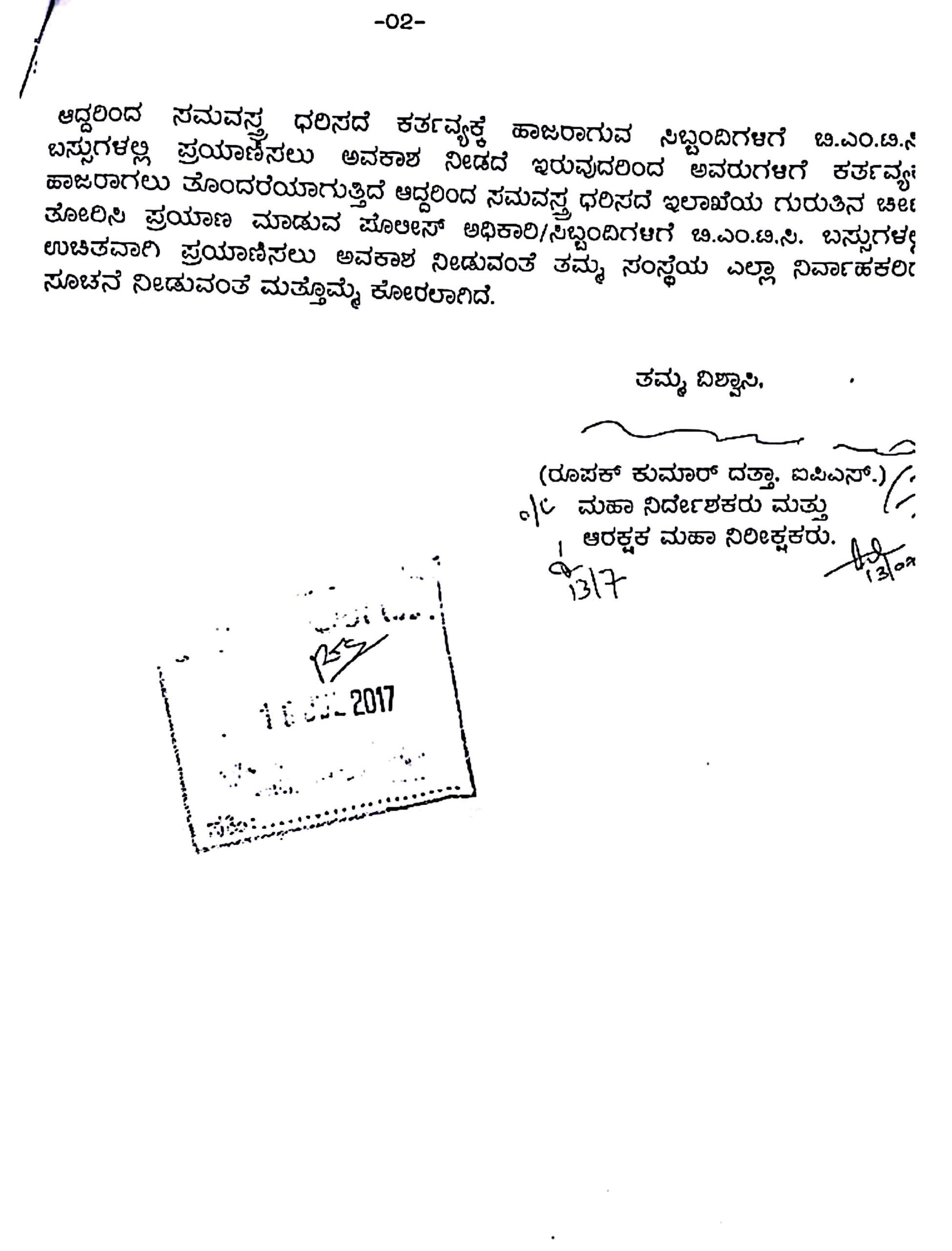 ಆದ್ದರಿಂದ ಸಮವಸ್ತ್ರ ಧರಿಸದೆ ಕರ್ತವ್ಯಕ್ಕೆ ಹಾಜರಾಗುವ ಸಿಬ್ಬಂದಿಗಳಗೆ ಬಿ.ಎಂ.ಟಿ.ಸಿ ಬಸ್ಸುಗಳಲ್ಲಿ ಪ್ರಯಾಣಿಸಲು ಅವಕಾಶ ನೀಡದೆ ಇರುವುದರಿಂದ ಅವರುಗಳಿಗೆ ಕರ್ತವ್ಯ ಹಾಜರಾಗಲು ತೊಂದರೆಯಾಗುತ್ತಿದೆ ಆದ್ದರಿಂದ ಸಮವಸ್ತ್ರ ಧರಿಸದೆ ಇಲಾಖೆಯ ಗುರುತಿನ ಚೀ ತೋರಿಸಿ ಪ್ರಯಾಣ ಮಾಡುವ ಪೊಲೀಸ್ ಅಧಿಕಾಲಿ/ಸಿಬ್ಬಂದಿಗಳಗೆ ಬಿ.ಎಂ.ಟಿ.ಸಿ. ಬಸ್ಸುಗಳ ಉಚಿತವಾಗಿ ಪ್ರಯಾಣಿಸಲು ಅವಕಾಶ ನೀಡುವಂತೆ ತಮ್ಮ ಸಂಸ್ಥೆಯ ಎಲ್ಲಾ ನಿರ್ವಾಹಕರ ಸೂಚನೆ ನೀಡುವಂತೆ ಕೋರಿದ್ದಾರೆ.