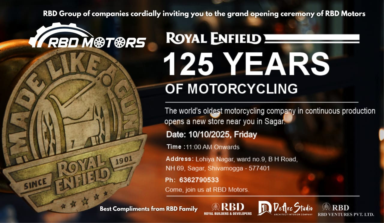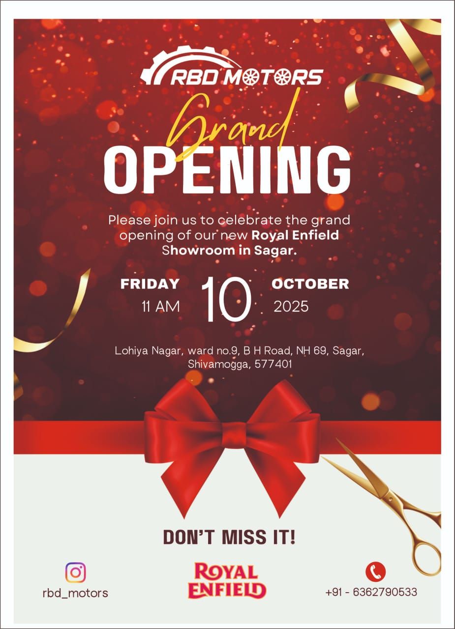 ಅಕ್ಟೋಬರ್.10, 2025ರಂದು ಶೋ ರೂಂ ಗ್ರಾಂಡ್ ಓಪನ್ ಸಂದರ್ಭದಲ್ಲೇ ನಿಮಗೆ ರಾಯಲ್ ಎನ್ಫೀಲ್ಡ್ ನ ಎಲ್ಲಾ ಮಾದರಿಯ ಬೈಕ್ ಗಳು ಮಾರಾಟಕ್ಕೆ ಲಭ್ಯವಾಗಲಿದ್ದಾವೆ. ರಾಯಲ್ ಎನ್ಫೀಲ್ಡ್ ಬೈಕ್ ಪ್ರಿಯರು ಇಂದೇ ತಮ್ಮ ನೆಚ್ಚಿನ ಬೈಕ್ ಬುಕ್ ಮಾಡುವಂತೆ ಆರ್ ಬಿ ಡಿ ಮೋಟಾರ್ಸ್ ಮನವಿ ಮಾಡಿದೆ.