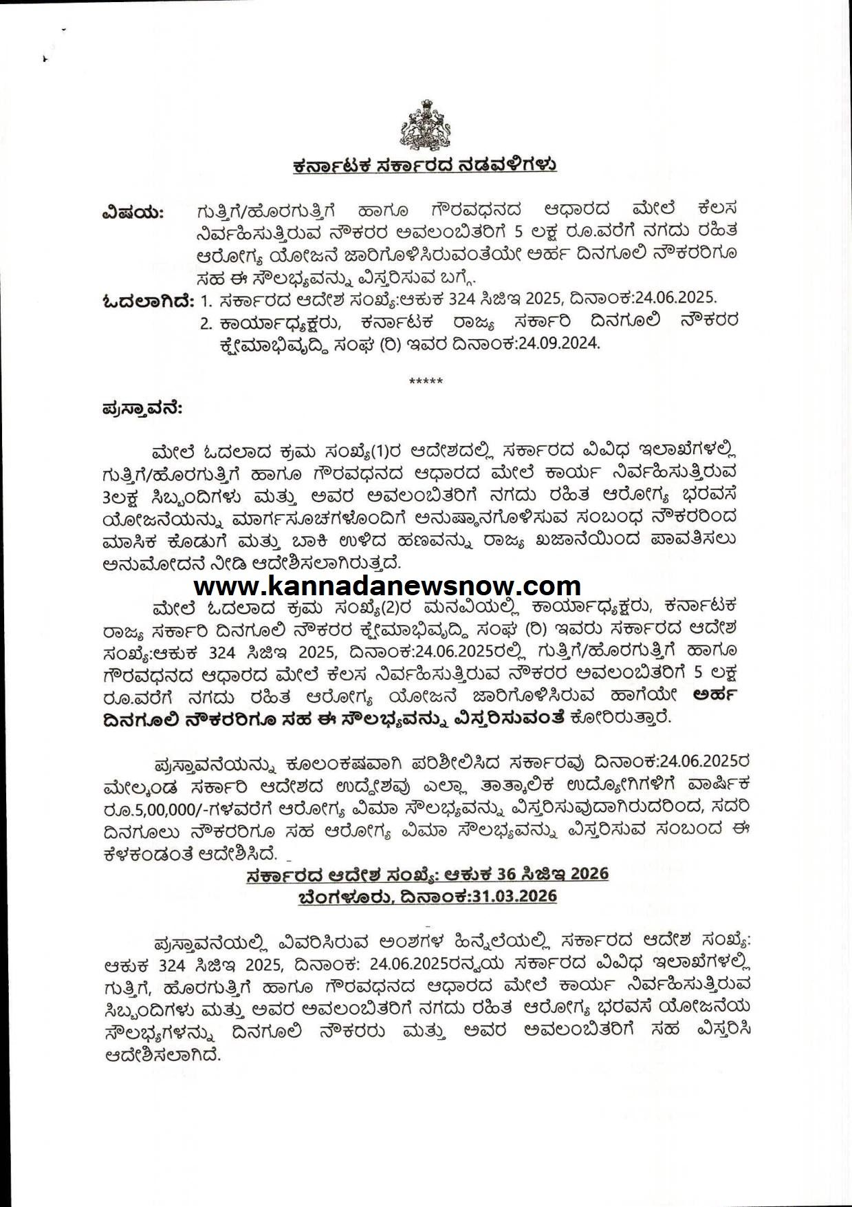 ದಿನಗೂಲಿ ನೌಕರರ ಮನವಿಯನ್ನು ಕೂಲಂಕಷವಾಗಿ ಪರಿಶೀಲಿಸಿದ ಸರ್ಕಾರವು, ಎಲ್ಲಾ ವರ್ಗದ ತಾತ್ಕಾಲಿಕ ಉದ್ಯೋಗಿಗಳಿಗೆ ಆರೋಗ್ಯ ಭದ್ರತೆ ಒದಗಿಸುವುದು ಯೋಜನೆಯ ಮೂಲ ಉದ್ದೇಶವಾಗಿದೆ ಎಂದು ಮನಗಂಡಿದೆ. ಈ ಹಿನ್ನೆಲೆಯಲ್ಲಿ, ಮಾರ್ಚ್ 31, 2026 ರಂದು ಹೊರಡಿಸಲಾದ ಹೊಸ ಆದೇಶದ (ಆಕುಕ 36 ಸಿಜಿಇ 2026) ಅನ್ವಯ, ದಿನಗೂಲಿ ನೌಕರರು ಮತ್ತು ಅವರ ಅವಲಂಬಿತರಿಗೂ ಈ ಯೋಜನೆಯನ್ನು ವಿಸ್ತರಿಸಲಾಗಿದೆ.