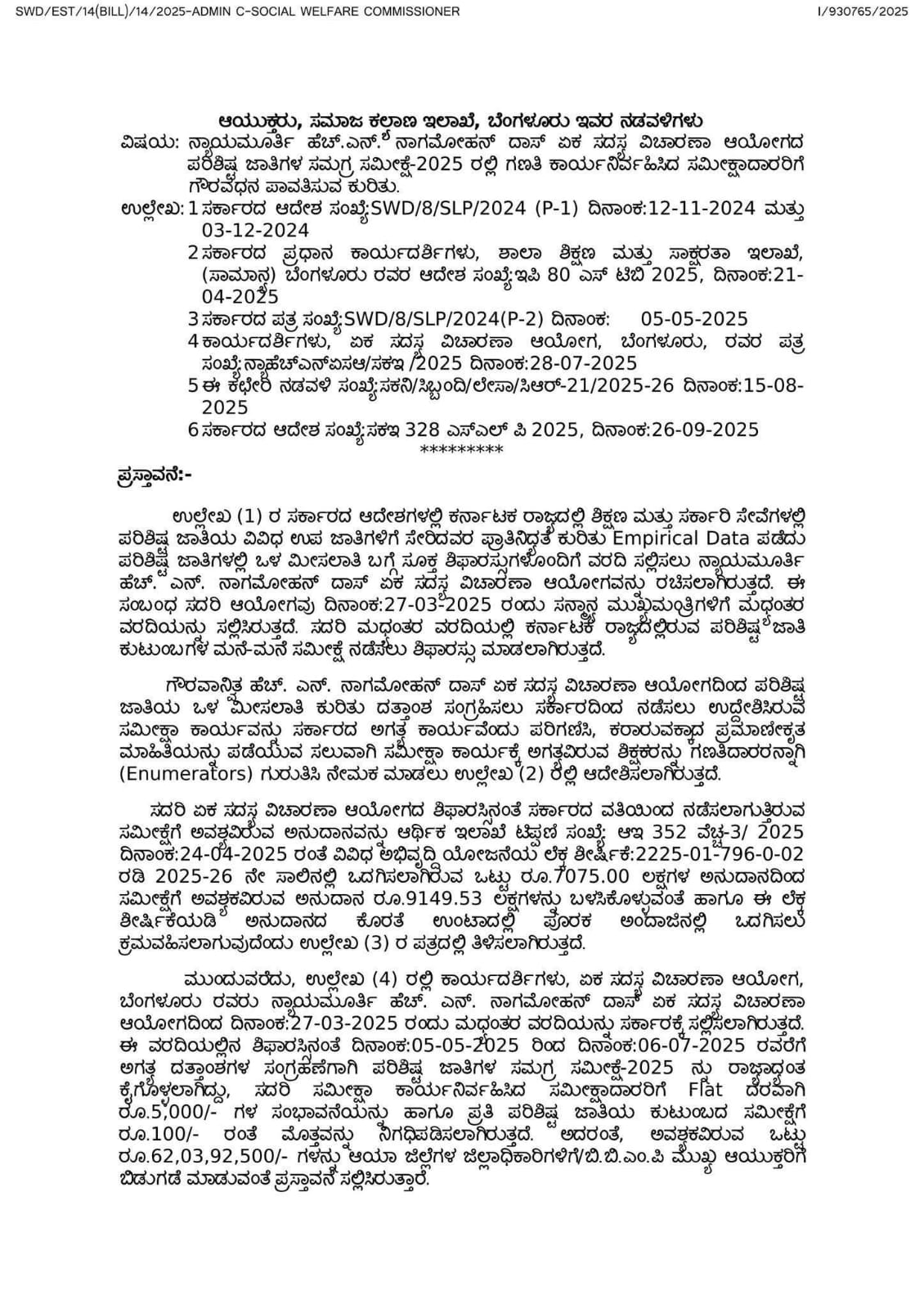 ಪ್ರಸ್ತಾವನೆಯಲ್ಲಿ ವಿವರಿಸಿರುವಂತೆ, ನ್ಯಾಯಮೂರ್ತಿ ಹೆಚ್. ಎನ್. ನಾಗಮೋಹನ್ ದಾಸ್ ಏಕ ಸದಸ್ಯ ವಿಚಾರಣಾ ಆಯೋಗದ ಮಧ್ಯಂತರ ವರದಿಯಲ್ಲಿನ ಶಿಫಾರಸ್ಸಿನಂತೆ ದಿನಾಂಕ:05-05-2025 ರಿಂದ ದಿನಾಂಕ:06-07-2025 ರವರೆಗೆ ಅಗತ್ಯ ದತ್ತಾಂಶಗಳ ಸಂಗ್ರಹಣೆಗಾಗಿ ಪರಿಶಿಷ್ಟ ಜಾತಿಗಳ ಸಮಗ್ರ ಸಮೀಕ್ಷೆ- 2025 ರಲ್ಲಿ ಗಣತಿದಾರರಾಗಿ ರಾಜ್ಯಾದ್ಯಂತ ಸಮೀಕ್ಷಾ ಕಾರ್ಯನಿರ್ವಹಿಸಿದ ಪ್ರತಿ ಸಮೀಕ್ಷಾದಾರರಿಗೆ Flat ದರದಲ್ಲಿ ಬಾಕಿ ಇರುವ ಮೊತ್ತ ತಲಾ ರೂ.2000/- ಗಳಂತೆ ಒಟ್ಟು ರೂ.11,52,00,000/- ಗಳ ಸಂಭಾವನೆಯನ್ನು ಹಾಗೂ ಸಮೀಕ್ಷೆಗೊಳಪಡಿಸಿದ ಪ್ರತಿ ಪರಿಶಿಷ್ಟ ಜಾತಿ ಮನೆಗೆ ರೂ.100/- ರಂತೆ ಒಟ್ಟು ರೂ.25,08,16,700/- ಗಳು ಸೇರಿ ಒಟ್ಟಾರೇ ರೂ.36,60,16,700/- (ಮೂವತ್ತಾರು ಕೋಟಿ ಅರವತ್ತು ಲಕ್ಷ ಹದಿನಾರು ಸಾವಿರ ಏಳುನೂರು ರೂಪಾಯಿ ಮಾತ್ರ) ಗಳನ್ನು ಅನುಬಂಧ-1 ರಲ್ಲಿ ಲಗತ್ತಿಸಿರುವ ಜಿಲ್ಲಾಧಿಕಾರಿಗಳ ಸಿ.ಓ ಕೋಡ್‌ಗಳಿಗೆ ಬಿಡುಗಡೆ ಮಾಡಿ ಆದೇಶಿಸಿದೆ.