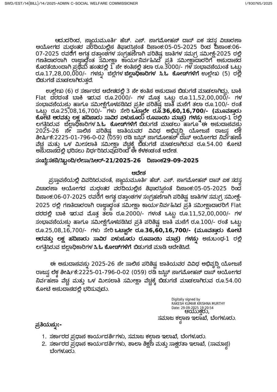 ಈ ಅನುದಾನವನ್ನು 2025-26 ನೇ ಸಾಲಿನ ಪರಿಶಿಷ್ಟ ಜಾತಿಯವರ ವಿವಿಧ ಅಭಿವೃದ್ಧಿ ಯೋಜನ ರಾಜಸ್ವ ಲೆಕ್ಕ ಶೀರ್ಷಿಕೆ:2225-01-796-0-02 (059) ರಡಿ ಜಸ್ಟಿಸ್ ನಾಗಮೋಹನ್‌ ದಾಸ್ ಆಯೋಗದ ನಿರ್ವಹಣಾ ವೆಚ್ಚ ಮತ್ತು ಒಳ ಮೀಸಲಾತಿ ಸಮೀಕ್ಷಣ ವೆಚ್ಚಕ್ಕೆ ಬಿಡುಗಡೆ ಮಾಡಲಾಗಿರುವ ರೂ.54.00 ಕೋಟಿ ಅನುದಾನದಲ್ಲಿ ಭರಿಸುವುದು ಎಂದಿದೆ.