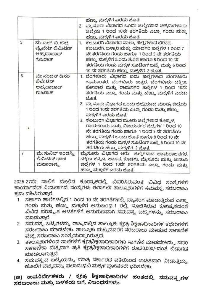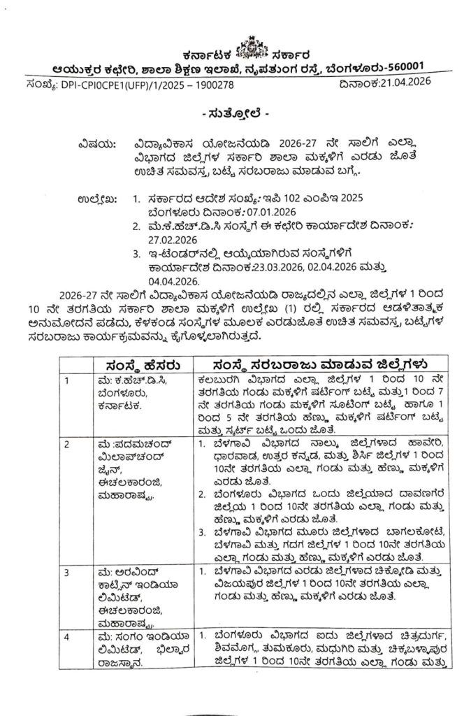 ಪೂರೈಕೆದಾರ ಸಂಸ್ಥೆಗಳ ಆಯ್ಕೆ: ವಿವಿಧ ಜಿಲ್ಲೆಗಳಿಗೆ ಸಮವಸ್ತ್ರ ಪೂರೈಸಲು ಕರ್ನಾಟಕ ರಾಜ್ಯ ಕೈಮಗ್ಗ ಅಭಿವೃದ್ಧಿ ನಿಗಮ ಸೇರಿದಂತೆ ಒಟ್ಟು 7 ಪ್ರಮುಖ ಸಂಸ್ಥೆಗಳಿಗೆ ಕಾರ್ಯಾದೇಶ ನೀಡಲಾಗಿದೆ.