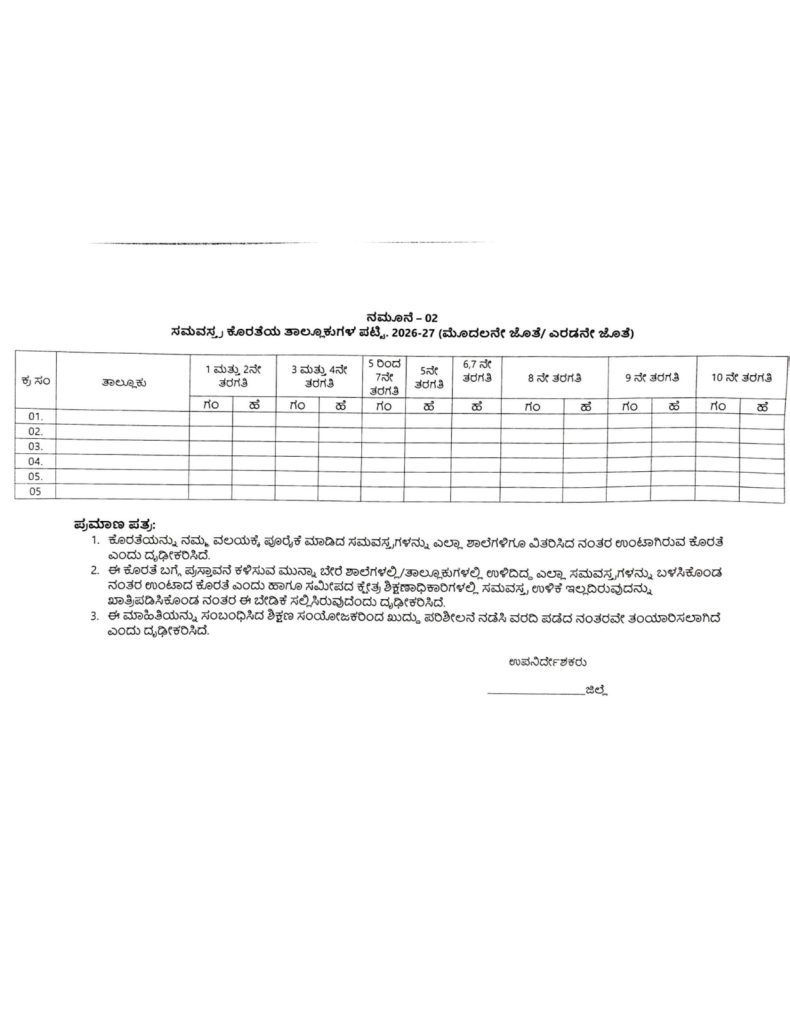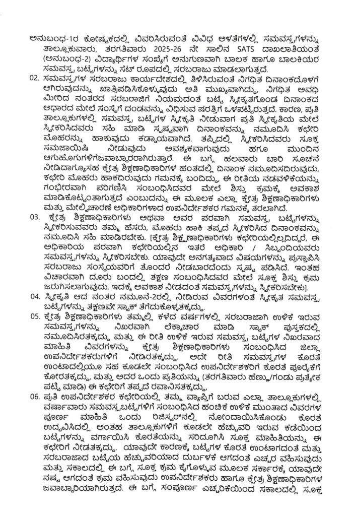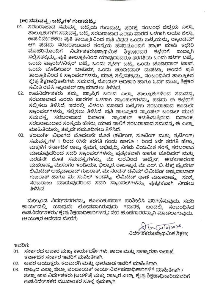 2025-26ನೇ ಸಾಲಿನ SATS (Student Achievement Tracking System) ದಾಖಲಾತಿಯ ಆಧಾರದ ಮೇಲೆ ಸಮವಸ್ತ್ರಗಳ ಪ್ರಮಾಣವನ್ನು ನಿಗದಿಪಡಿಸಲಾಗಿದೆ. ಶಾಲೆಗಳಿಗೆ ಸಮವಸ್ತ್ರ ತಲುಪಿದ ತಕ್ಷಣ ಮುಖ್ಯೋಪಾಧ್ಯಾಯರು ಮಕ್ಕಳಿಗೆ ವಿತರಿಸಿ, ಪೋಷಕರಿಂದ ಸ್ವೀಕೃತಿ ಪತ್ರ ಪಡೆದು ಮೂರು ದಿನದೊಳಗೆ ಇಲಾಖೆಗೆ ವರದಿ ಸಲ್ಲಿಸಬೇಕಿದೆ.