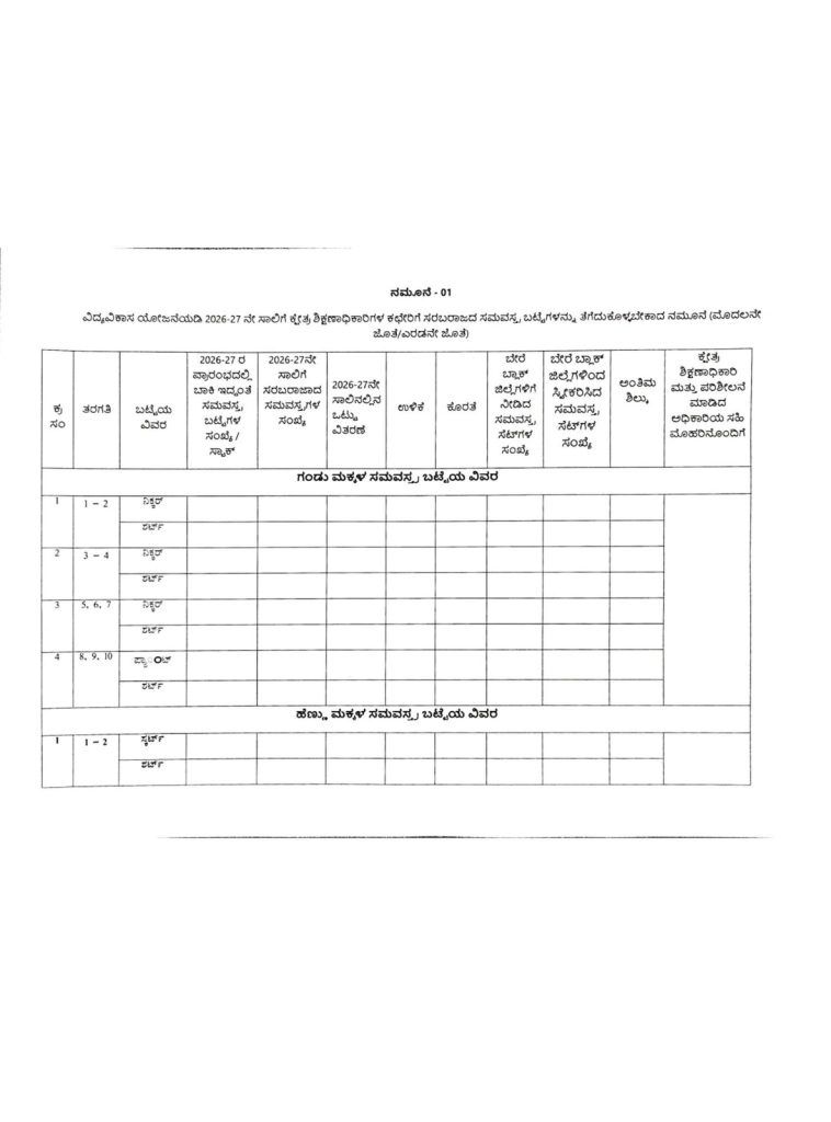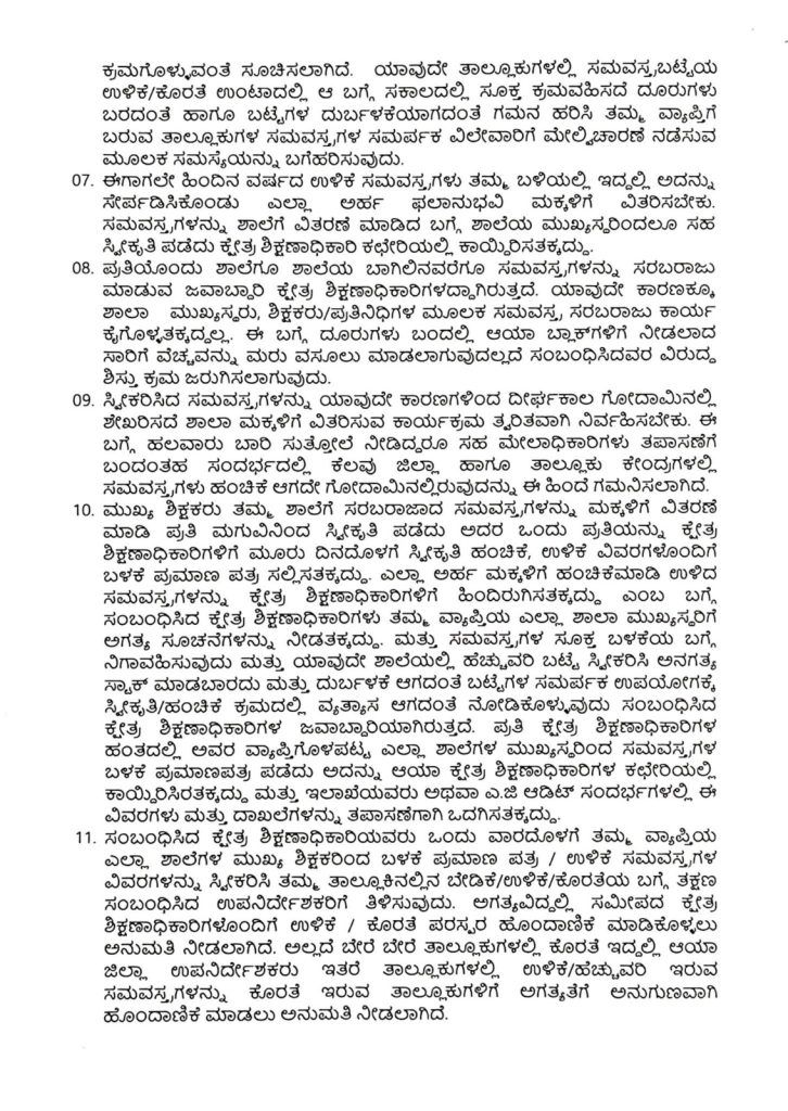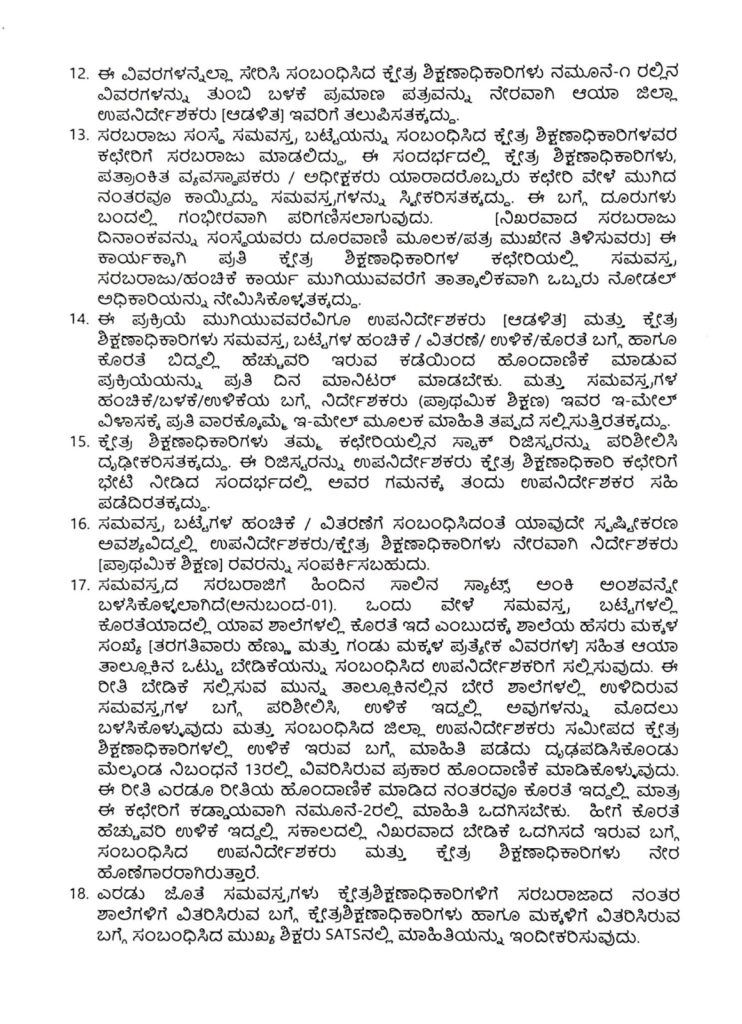 ಸಾರಿಗೆ ವೆಚ್ಚದ ಅನುದಾನ: ಸಮವಸ್ತ್ರಗಳನ್ನು ತಾಲೂಕು ಕೇಂದ್ರಗಳಿಂದ ಶಾಲೆಗಳಿಗೆ ತಲುಪಿಸಲು ಪ್ರತಿ ಕ್ಷೇತ್ರ ಶಿಕ್ಷಣಾಧಿಕಾರಿಗಳ (BEO) ಕಚೇರಿಗೆ 20,000 ರೂ. ಗಳ ಸಾರಿಗೆ ವೆಚ್ಚವನ್ನು ಬಿಡುಗಡೆ ಮಾಡಲಾಗಿದೆ.