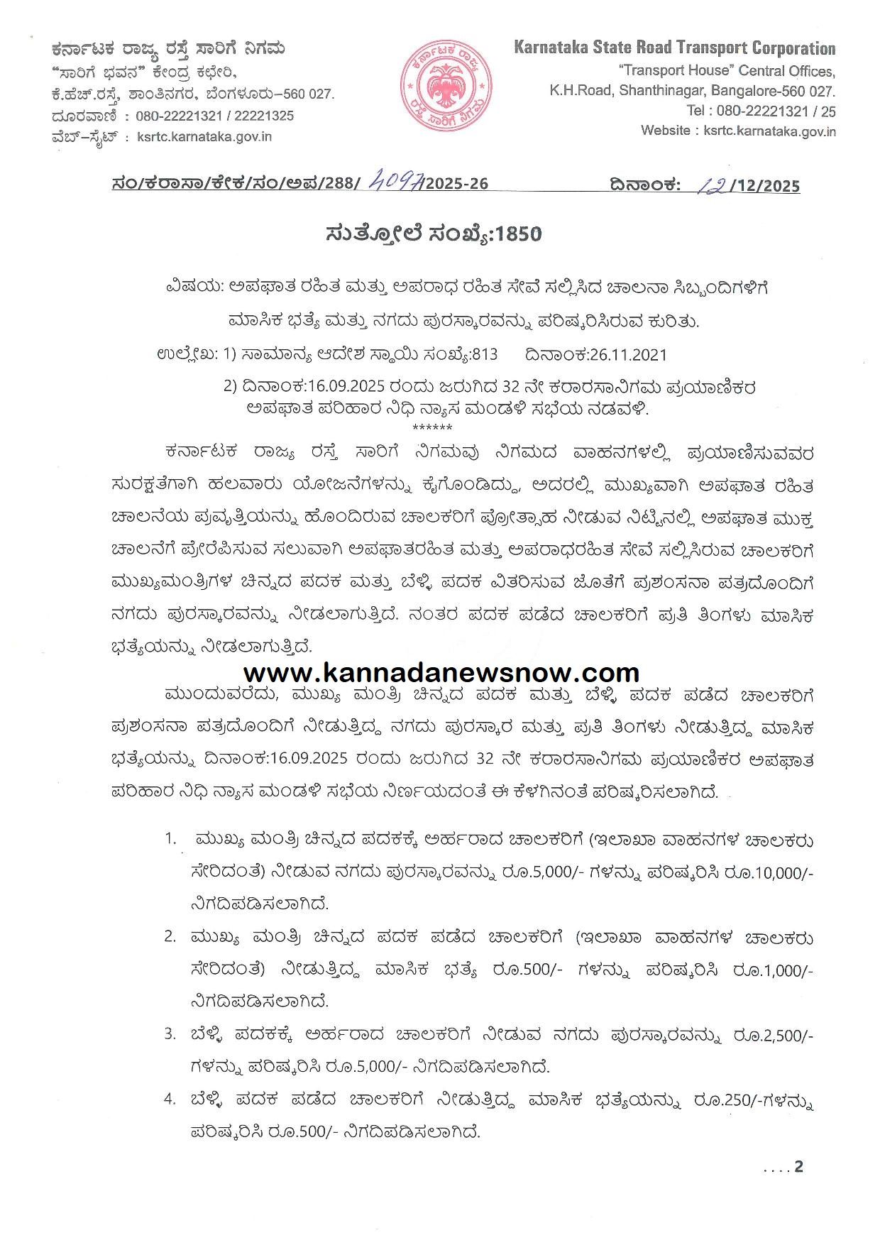ಮುಂದುವರೆದು, ಮುಖ್ಯ ಮಂತ್ರಿ ಚಿನ್ನದ ಪದಕ ಮತ್ತು ಬೆಳ್ಳಿ ಪದಕ ಪಡೆದ ಚಾಲಕರಿಗೆ ಪಶಂಸನಾ ಪತ್ರದೊಂದಿಗೆ ನೀಡುತ್ತಿದ್ದ ನಗದು ಪುರಸ್ಕಾರ ಮತ್ತು ಪ್ರತಿ ತಿಂಗಳು ನೀಡುತ್ತಿದ್ದ ಮಾಸಿಕ ಭತ್ಯೆಯನ್ನು ದಿನಾಂಕ:16.09.2025 ರಂದು ಜರುಗಿದ 32 ನೇ ಕರಾರಸಾನಿಗಮ ಪುಯಾಣಿಕರ ಅಪಘಾತ ಪರಿಹಾರ ನಿಧಿ ನ್ಯಾಸ ಮಂಡಳಿ ಸಭೆಯ ನಿರ್ಣಯದಂತೆ ಈ ಕೆಳಗಿನಂತೆ ಪರಿಷ್ಕರಿಸಲಾಗಿದೆ ಎಂದು ಹೇಳಿದ್ದಾರೆ.