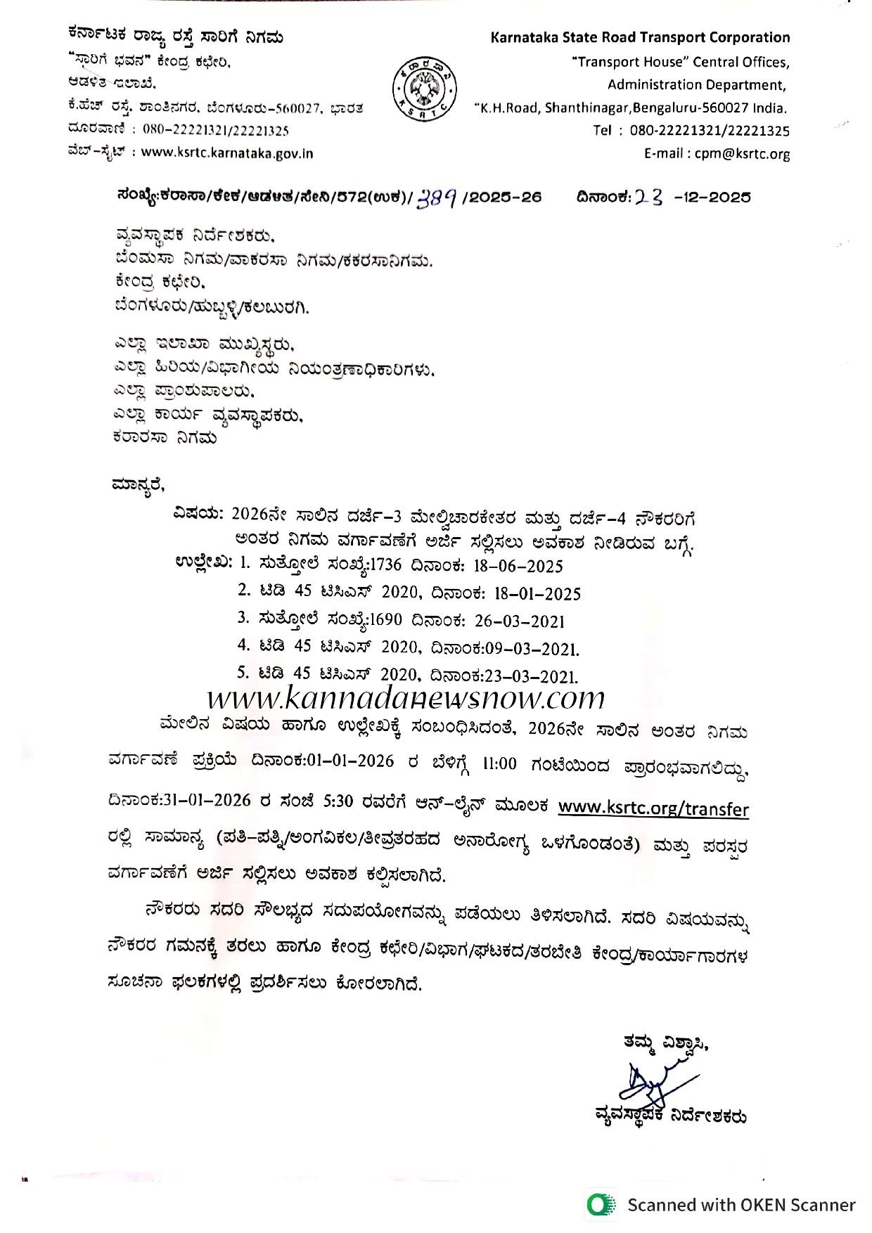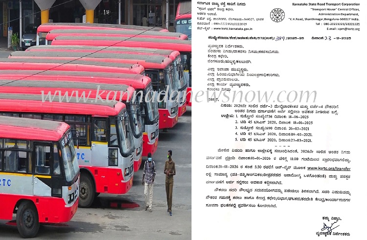 ಈ ಕುರಿತಂತೆ ಕೆ ಎಸ್ ಆರ್ ಟಿ ಸಿಯ ವ್ಯವಸ್ಥಾಪಕ ನಿರ್ದೇಶಕರು,  2026ನೇ ಸಾಲಿನ ಅಂತರ ನಿಗಮ ವರ್ಗಾವಣೆ ಪ್ರಕ್ರಿಯೆ ದಿನಾಂಕ:01-01-2026 ರ ಬೆಳಿಗ್ಗೆ 11:00 ಗಂಟೆಯಿಂದ ಪ್ರಾರಂಭವಾಗಲಿದ್ದು, ದಿನಾಂಕ:31-01-2026 ರ ಸಂಜೆ 5:30 ರವರೆಗೆ ಆನ್-ಲೈನ್ ಮೂಲಕ www.ksrtc.org/transfer ರಲ್ಲಿ ಸಾಮಾನ್ಯ (ಪತಿ-ಪತ್ನಿ/ಅಂಗವಿಕಲ/ತೀವ್ರತರಹದ ಅನಾರೋಗ್ಯ ಒಳಗೊಂಡಂತೆ) ಮತ್ತು ಪರಸ್ಪರ ವರ್ಗಾವಣೆಗೆ ಅರ್ಜಿ ಸಲ್ಲಿಸಲು ಅವಕಾಶ ಕಲ್ಪಿಸಲಾಗಿದೆ ಎಂದಿದ್ದಾರೆ.