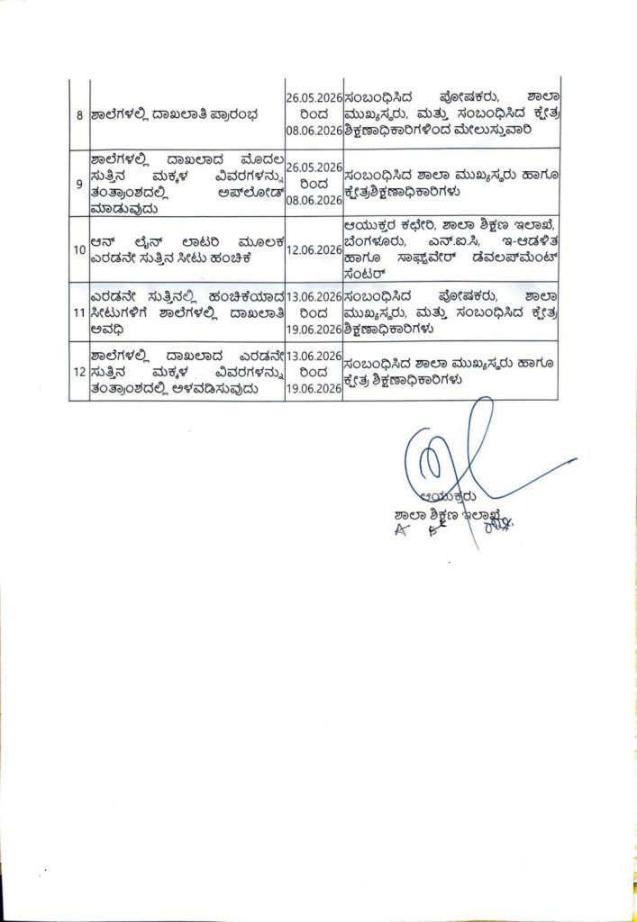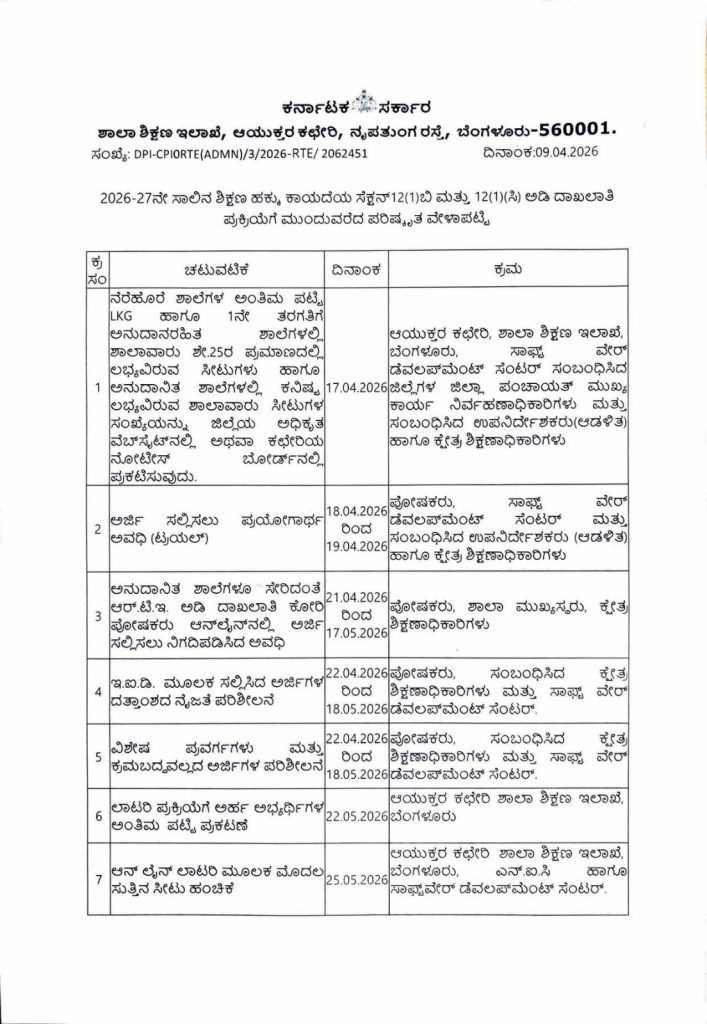 ಶಾಲಾ ಶಿಕ್ಷಣ ಇಲಾಖೆಯ ಆಯುಕ್ತರ ಕಛೇರಿಯು ಈ ವೇಳಾಪಟ್ಟಿಯನ್ನು ಹೊರಡಿಸಿದ್ದು, ಪೋಷಕರು ನಿಗದಿತ ಅವಧಿಯೊಳಗೆ ಅಗತ್ಯ ದಾಖಲೆಗಳೊಂದಿಗೆ ಅರ್ಜಿ ಸಲ್ಲಿಸಲು ಸೂಚಿಸಲಾಗಿದೆ.
