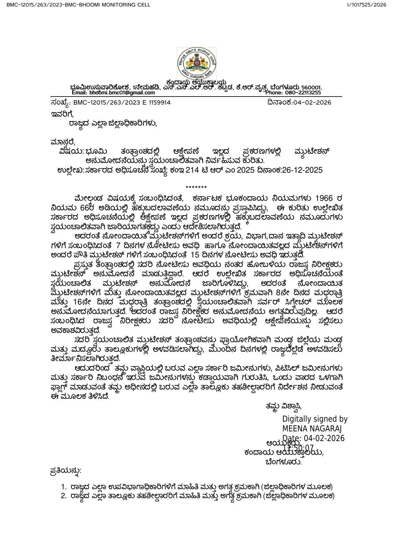 ಮೇಲ್ಕಂಡ ವಿಷಯಕ್ಕೆ ಸಂಬಂಧಿಸಿದಂತೆ, ಕರ್ನಾಟಕ ಭೂಕಂದಾಯ ನಿಯಮಗಳು 1966 ರ ನಿಯಮ 66ರ ಅಡಿಯಲ್ಲಿ ಹಕ್ಕುಬದಲಾವಣೆಯ ನಮೂದನ್ನು ಪ್ರಸ್ತಾಪಿಸಿದ್ದು, ಈ ಕುರಿತು ಉಲ್ಲೇಖಿತ ಸರ್ಕಾರದ ಅಧಿಸೂಚನೆಯಲ್ಲಿ ಆಕ್ಷೇಪಣೆ ಇಲ್ಲದ ಪ್ರಕರಣಗಳಲ್ಲಿ ಹಕ್ಕುಬದಲಾವಣೆಯ ನಮೂದುಗಳು ಸ್ವಯಂಚಾಲಿತವಾಗಿ ಜಾರಿಯಾಗತಕ್ಕದ್ದು ಎಂದು ಆದೇಶಿಸಲಾಗಿರುತ್ತದೆ.