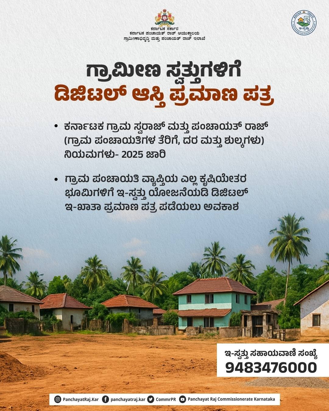 ಗ್ರಾಮ ಪಂಚಾಯತಿ ವ್ಯಾಪ್ತಿಯ ಎಲ್ಲ ಕೃಷಿಯೇತರ ಭೂಮಿಗಳಿಗೆ ಇ-ಸ್ವತ್ತು ಯೋಜನೆಯಡಿ ಡಿಜಿಟಲ್ ಇ-ಖಾತಾ ಪ್ರಮಾಣ ಪತ್ರ ಪಡೆಯಲು ಅವಕಾಶ.