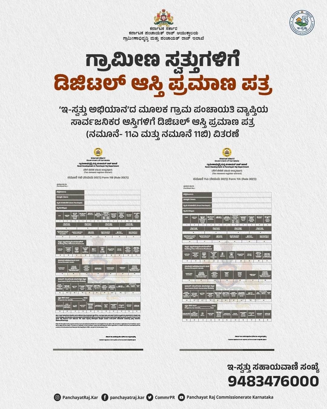 ಬೆಂಗಳೂರು : ಗ್ರಾಮ ಪಂಚಾಯತಿ ವ್ಯಾಪ್ತಿಯ ಆಸ್ತಿಗಳಿಗೆ ಹಾಗೂ ಕೃಷಿಯೇತರ ಆಸ್ತಿಗಳಿಗೆ ನಮೂನೆ 11ಎ ಮತ್ತು ನಮೂನೆ 11ಬಿ ನೀಡಲಾಗುತ್ತದೆ. ನಾಗರಿಕರು ಮನೆಯಲ್ಲೇ ಕುಳಿತು https://eswathu.karnataka.gov.in/ ಇ- ಸ್ವತ್ತು ತಂತ್ರಾಂಶ 2.0 ಮುಖಾಂತರ ಅರ್ಜಿ ಸಲ್ಲಿಸಿ.