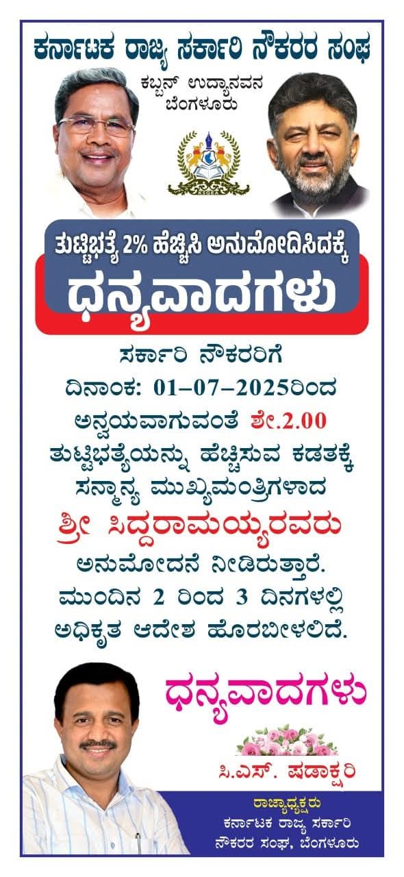 ಈ ಕುರಿತಂತೆ ಕರ್ನಾಟಕ ರಾಜ್ಯ ಸರ್ಕಾರಿ ನೌಕರರ ಸಂಘದ ರಾಜ್ಯಾಧ್ಯಕ್ಷ ಸಿ.ಎಸ್ ಷಡಕ್ಷರಿ ಮಾಹಿತಿ ಹಂಚಿಕೊಂಡಿದ್ದು, ಸರ್ಕಾರಿ ನೌಕರರಿಗೆ ದಿನಾಂಕ 01-07-2025ರಿಂದ ಅನ್ವಯವಾಗುವಂತೆ ಶೇ.2ರಷ್ಟು ತುಟ್ಟಿಭತ್ಯೆಯನ್ನು ಹೆಚ್ಚಿಸುವ ಕಡತಕ್ಕೆ ಸಿಎಂ ಸಿದ್ಧರಾಮಯ್ಯ ಅನುಮೋದಿಸಿದ್ದಾರೆ ಎಂದು ತಿಳಿಸಿದ್ದಾರೆ.