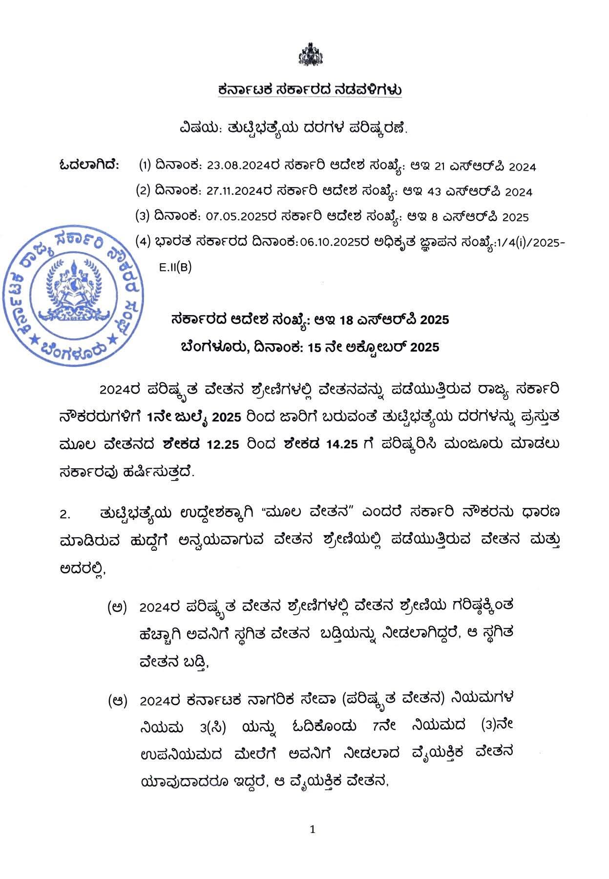 ಈ ಕುರಿತಂತೆ ರಾಜ್ಯ ಸರ್ಕಾರದಿಂದ ಅಧಿಕೃತ ಆದೇಶ ಹೊರಿಡಿಸಿದ್ದು, 2024ರ ಪರಿಷ್ಕೃತ ವೇತನ ಶ್ರೇಣಿಗಳಲ್ಲಿ ವೇತನವನ್ನು ಪಡೆಯುತ್ತಿರುವ ರಾಜ್ಯ ಸರ್ಕಾರಿ ನೌಕರರುಗಳಿಗೆ 1ನೇ ಜುಲೈ 2025 ರಿಂದ ಜಾರಿಗೆ ಬರುವಂತೆ ತುಟ್ಟಿಭತ್ಯೆಯ ದರಗಳನ್ನು ಪ್ರಸ್ತುತ ಮೂಲ ವೇತನದ ಶೇಕಡ 12.25 ರಿಂದ ಶೇಕಡ 14.25 ಗೆ ಪರಿಷ್ಕರಿಸಿ ಮಂಜೂರು ಮಾಡಲು ಸರ್ಕಾರವು ಹರ್ಷಿಸುತ್ತದೆ ಎಂದಿದೆ.