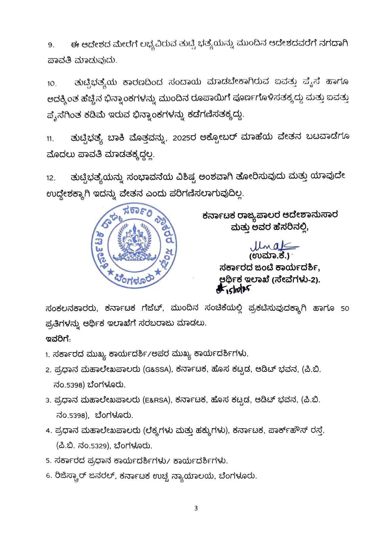 11. ತುಟ್ಟಿ ಭತ್ಯೆ ಬಾಕಿ ಮೊತ್ತವನ್ನು, 2025ರ ಅಕ್ಟೋಬರ್ ಮಾಹೆಯ ವೇತನ ಬಟವಾಡೆಗೂ ಮೊದಲು ಪಾವತಿ ಮಾಡತಕ್ಕದ್ದಲ್ಲ.