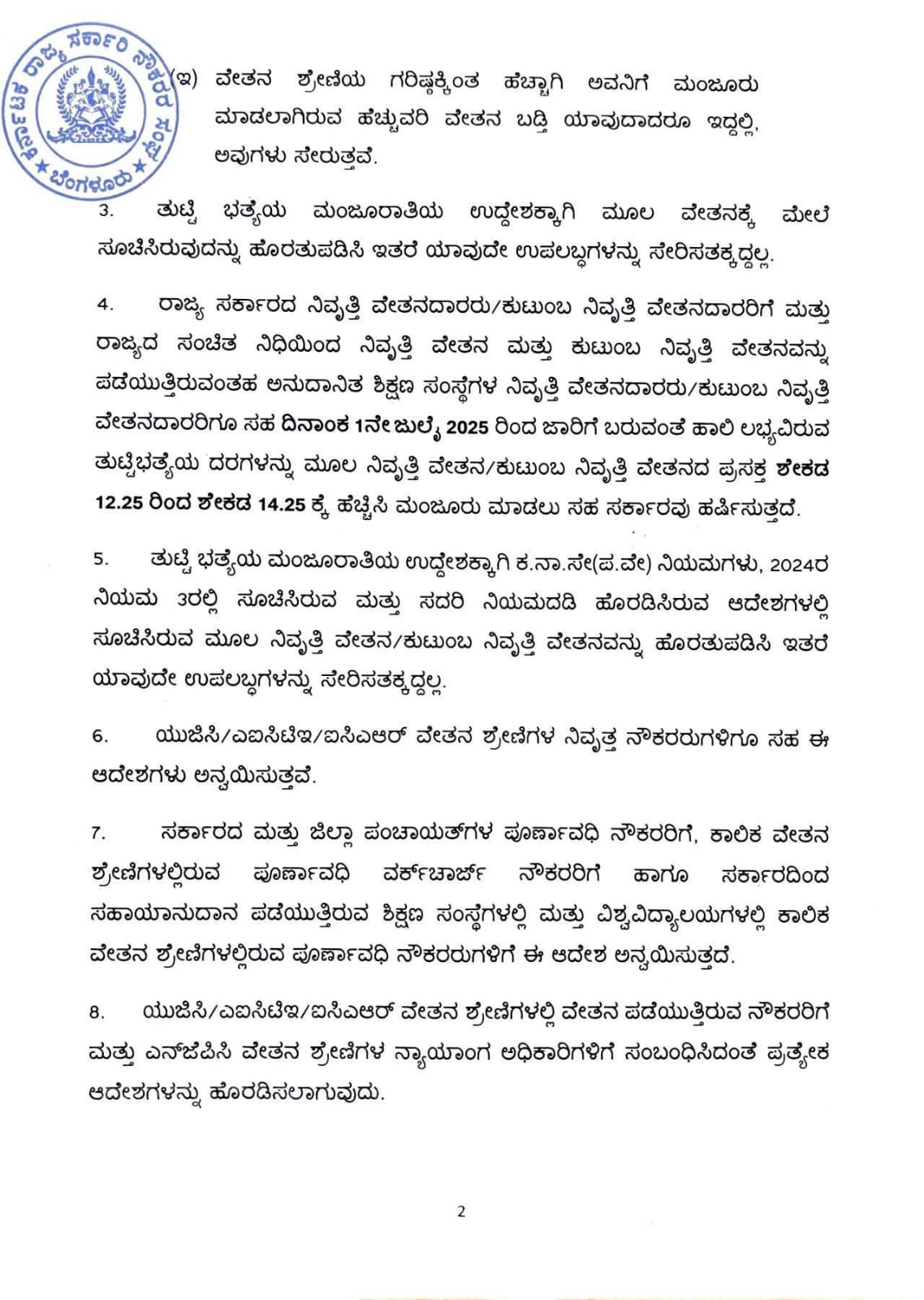 ರಾಜ್ಯ ಸರ್ಕಾರದ ನಿವೃತ್ತಿ ವೇತನದಾರರು/ಕುಟುಂಬ ನಿವೃತ್ತಿ ವೇತನದಾರರಿಗೆ ಮತ್ತು ರಾಜ್ಯದ ಸಂಚಿತ ನಿಧಿಯಿಂದ ನಿವೃತ್ತಿ ವೇತನ ಮತ್ತು ಕುಟುಂಬ ನಿವೃತ್ತಿ ವೇತನವನ್ನು ಪಡೆಯುತ್ತಿರುವಂತಹ ಅನುದಾನಿತ ಶಿಕ್ಷಣ ಸಂಸ್ಥೆಗಳ ನಿವೃತ್ತಿ ವೇತನದಾರರು/ಕುಟುಂಬ ನಿವೃತ್ತಿ ವೇತನದಾರರಿಗೂ ಸಹ ದಿನಾಂಕ 1ನೇ ಜುಲೈ 2025 ರಿಂದ ಜಾರಿಗೆ ಬರುವಂತೆ ಹಾಲಿ ಲಭ್ಯವಿರುವ ತುಟ್ಟಿಭತ್ಯೆಯ ದರಗಳನ್ನು ಮೂಲ ನಿವೃತ್ತಿ ವೇತನ/ಕುಟುಂಬ ನಿವೃತ್ತಿ ವೇತನದ ಪ್ರಸಕ್ತ ಶೇಕಡ 12.25 ರಿಂದ ಶೇಕಡ 14.25 ಕ್ಕೆ ಹೆಚ್ಚಿಸಿ ಮಂಜೂರು ಮಾಡಲು ಸಹ ಸರ್ಕಾರವು ಹರ್ಷಿಸುತ್ತದೆ.