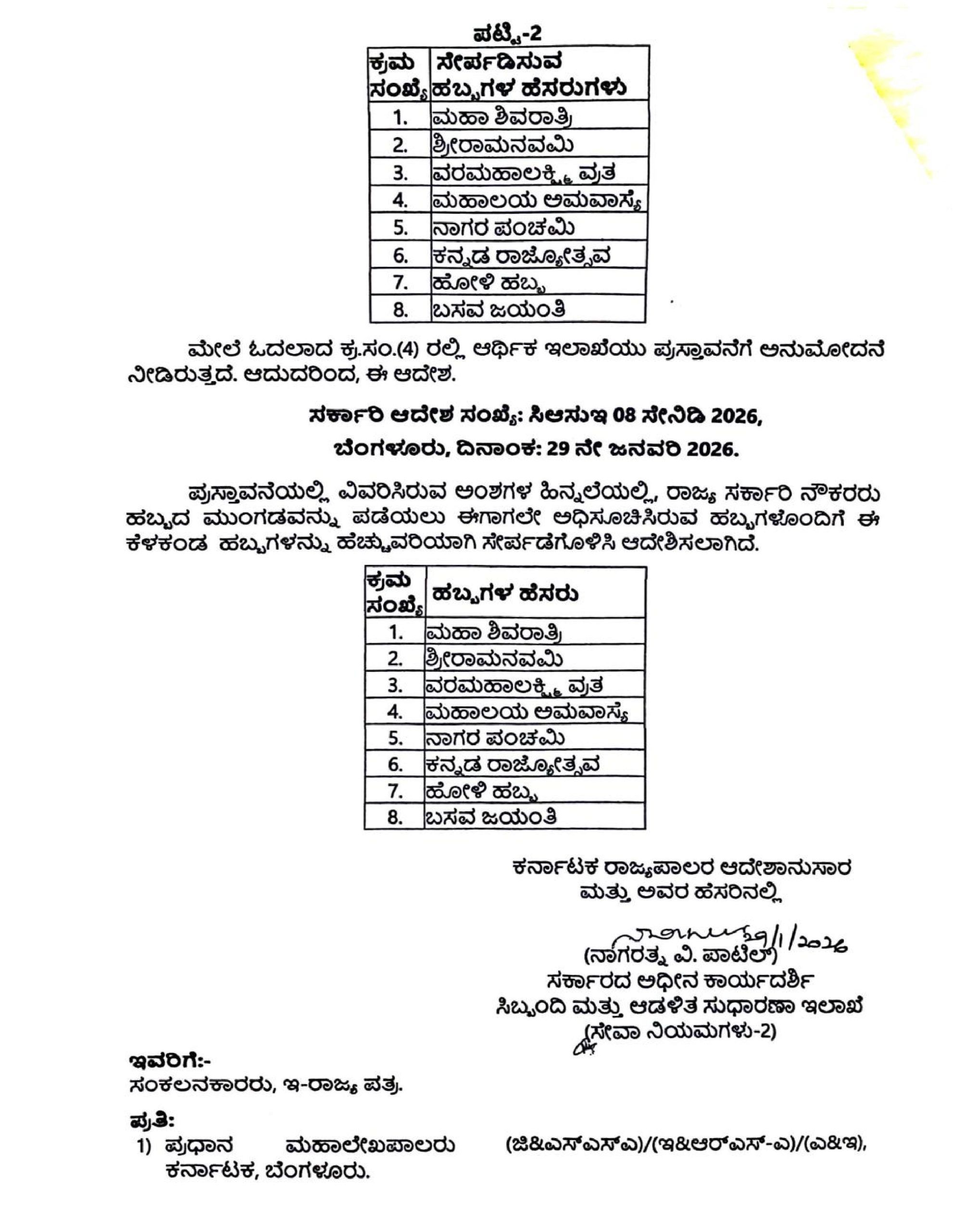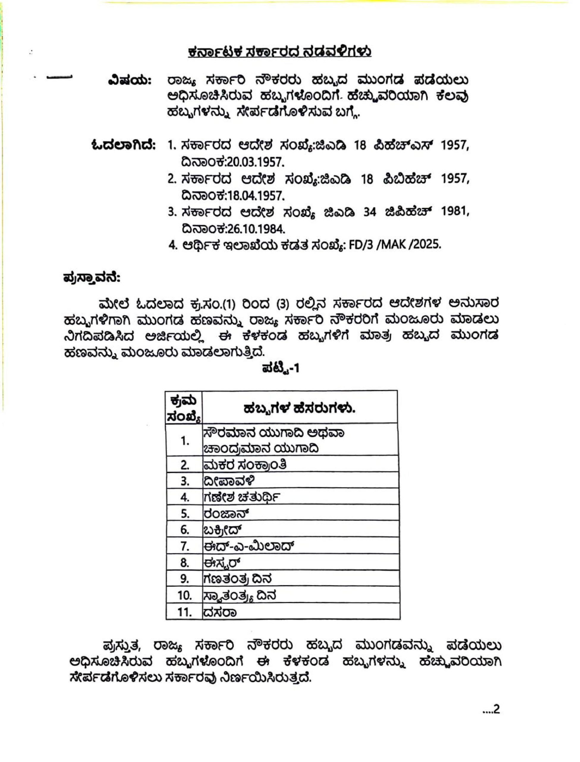 ಆರ್ಥಿಕ ಇಲಾಖೆಯು ಪ್ರಸ್ತಾವನೆಗೆ ಅನುಮೋದನೆ ನೀಡಿರುತ್ತದೆ. ಆದುದರಿಂದ, ಪ್ರಸ್ತಾವನೆಯಲ್ಲಿ ವಿವರಿಸಿರುವ ಅಂಶಗಳ ಹಿನ್ನಲೆಯಲ್ಲಿ, ರಾಜ್ಯ ಸರ್ಕಾರಿ ನೌಕರರು ಹಬ್ಬದ ಮುಂಗಡವನ್ನು ಪಡೆಯಲು ಈಗಾಗಲೇ ಅಧಿಸೂಚಿಸಿರುವ ಹಬ್ಬಗಳೊಂದಿಗೆ ಈ ಕೆಳಕಂಡ ಹಬ್ಬಗಳನ್ನು ಹೆಚ್ಚುವರಿಯಾಗಿ ಸೇರ್ಪಡೆಗೊಳಿಸಿ ಆದೇಶಿಸಿದ್ದಾರೆ.