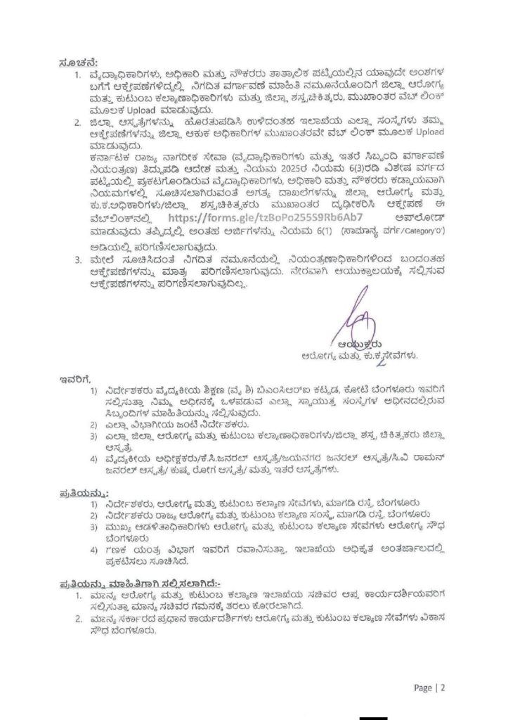 ಆಕ್ಷೇಪಣೆ ಸಲ್ಲಿಕೆ: ತಾತ್ಕಾಲಿಕ ಪಟ್ಟಿಯಲ್ಲಿ ಯಾವುದೇ ವ್ಯತ್ಯಾಸಗಳಿದ್ದಲ್ಲಿ, ಸಿಬ್ಬಂದಿಗಳು ಜಿಲ್ಲಾ ಆರೋಗ್ಯ ಮತ್ತು ಕುಟುಂಬ ಕಲ್ಯಾಣಾಧಿಕಾರಿಗಳು ಅಥವಾ ಜಿಲ್ಲಾ ಶಸ್ತ್ರಚಿಕಿತ್ಸಕರ ಮೂಲಕ ನಿಗದಿತ ವೆಬ್ ಲಿಂಕ್ನಲ್ಲಿ ಆಕ್ಷೇಪಣೆಗಳನ್ನು ಅಪ್ಲೋಡ್ ಮಾಡಬೇಕು.