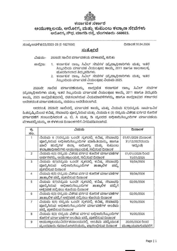 ಬೆಂಗಳೂರು: ರಾಜ್ಯ ಸರ್ಕಾರದ ಆರೋಗ್ಯ ಮತ್ತು ಕುಟುಂಬ ಕಲ್ಯಾಣ ಇಲಾಖೆಯ ಅಡಿಯಲ್ಲಿ ಬರುವ ವೈದ್ಯಾಧಿಕಾರಿಗಳು ಹಾಗೂ ಸಿಬ್ಬಂದಿಗಳ 2026ನೇ ಸಾಲಿನ ಸಾಮಾನ್ಯ ಮತ್ತು ಕೋರಿಕೆ ವರ್ಗಾವಣೆಗೆ ಸಂಬಂಧಿಸಿದಂತೆ ಅಧಿಕೃತ ವೇಳಾಪಟ್ಟಿಯನ್ನು ಪ್ರಕಟಿಸಲಾಗಿದೆ. ಕರ್ನಾಟಕ ರಾಜ್ಯ ಸಿವಿಲ್ ಸೇವೆಗಳ (ವರ್ಗಾವಣೆ ನಿಯಂತ್ರಣ) ಕಾಯ್ದೆಯನ್ವಯ ಈ ಪ್ರಕ್ರಿಯೆ ನಡೆಯಲಿದೆ.