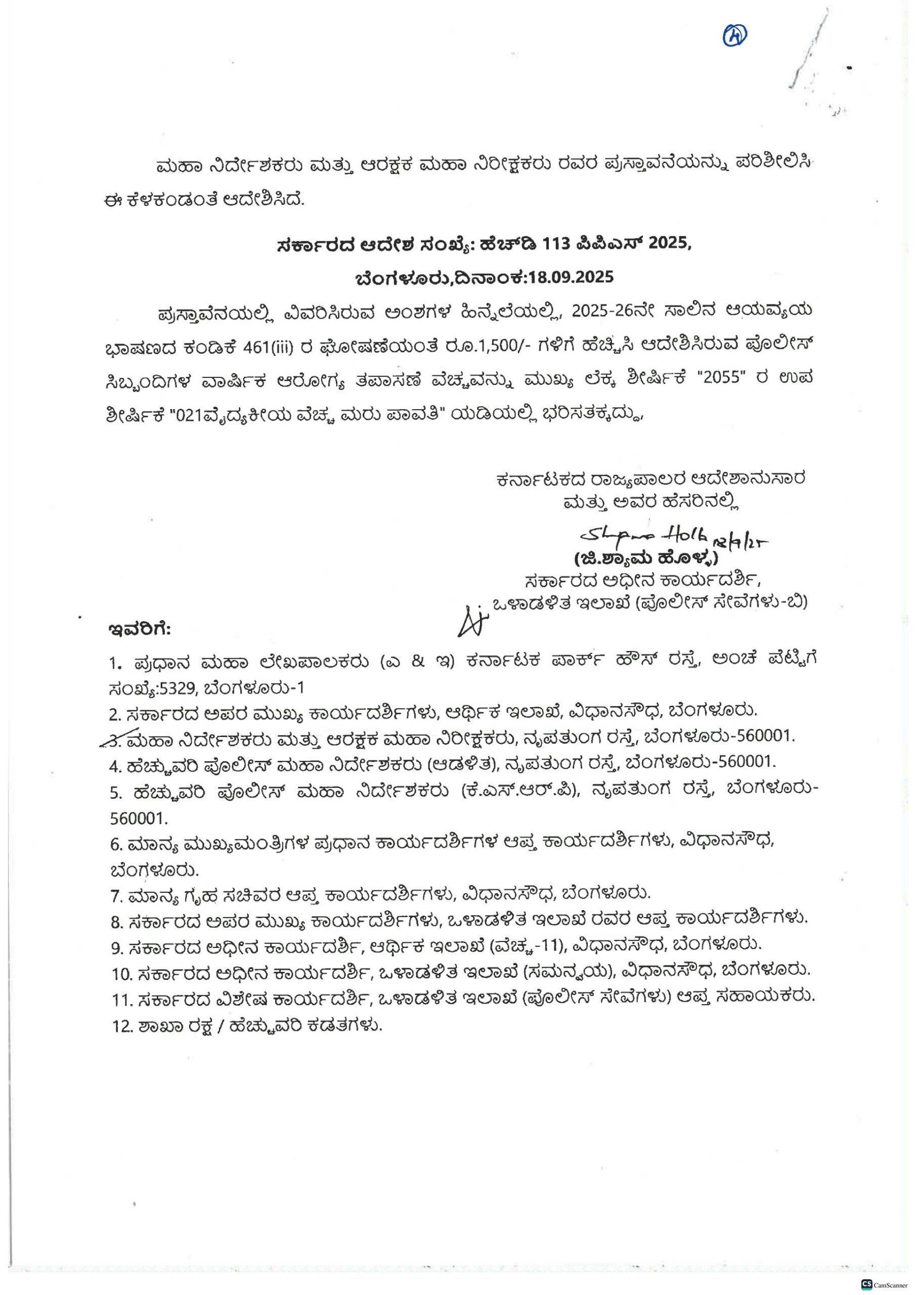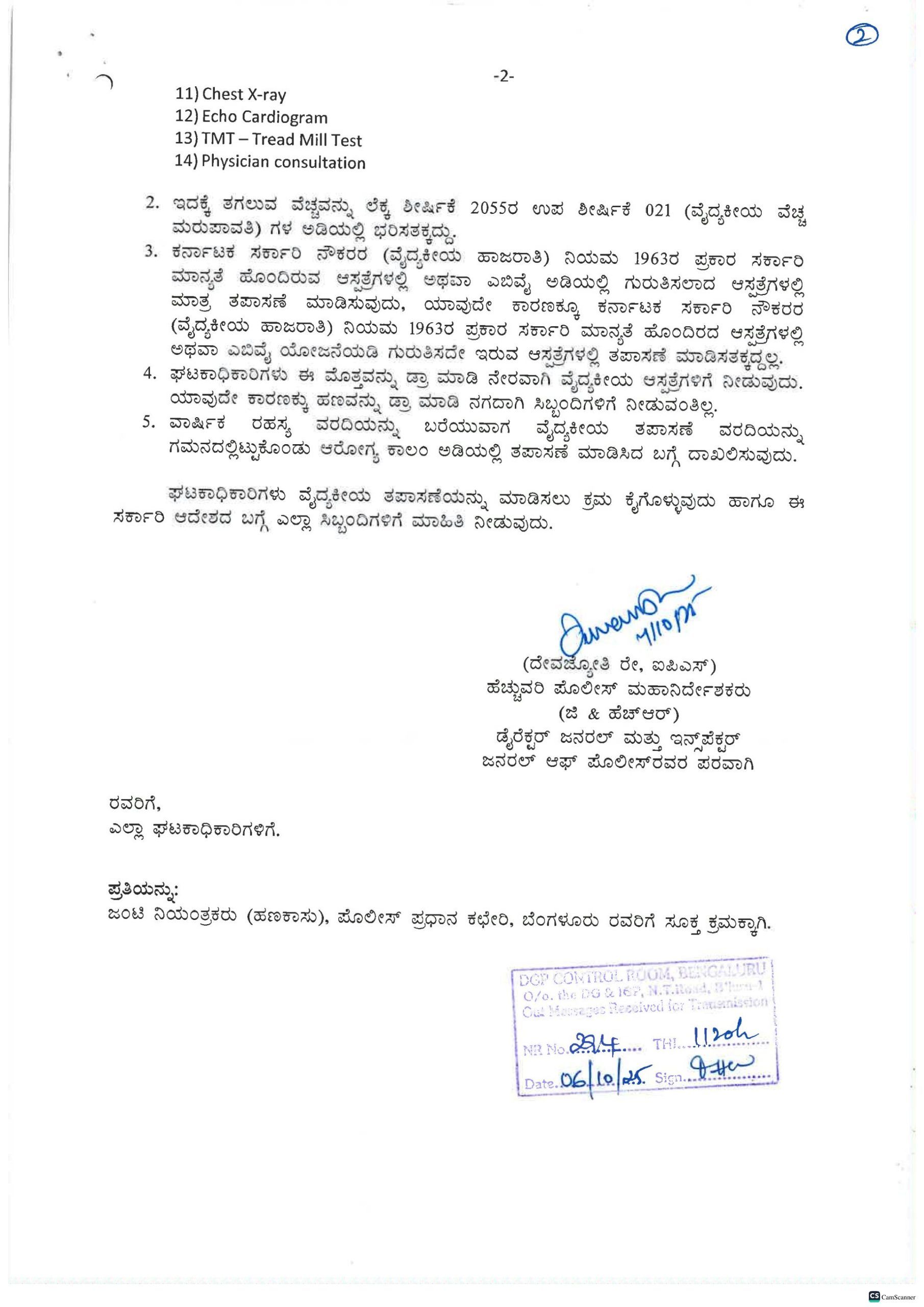 ಈ ಕುರಿತು ಡೈರೆಕ್ಟರ್ ಜನರಲ್ ಮತ್ತು ಇನ್ಸ್ ಪೆಕ್ಟರ್ ಜರಲ್ ಆಫ್ ಪೊಲೀಸ್ ಅವರ ಕಚೇರಿಯಿಂದ ಸುತ್ತೋಲೆ ಹೊರಡಿಸಲಾಗಿದ್ದು, ಪ್ರತಿಯೊಬ್ಬ ಪೊಲೀಸ್ ಸಿಬ್ಬಂದಿಗೆ ವಾರ್ಷಿಕ ಆರೋಗ್ಯ ತಪಾಸಣೆಗಾಗಿ ವೈದ್ಯಕೀಯ ವೆಚ್ಚ ರೂ. 1000/- ಗಳಿಂದ ರೂ. 1500/- (ಒಂದು ಸಾವಿರದ ಐದು ನೂರು ರೂಪಾಯಿಗಳು ಮಾತ್ರ) ಗಳಿಗೆ ಹೆಚ್ಚಿಸಿ ಆದೇಶಿಸಲಾಗಿದ್ದು, ಸದರಿ ಸರ್ಕಾರದ ಆದೇಶವನ್ನು ಸೂಕ್ತ ಕ್ರಮಕ್ಕಾಗಿ ಈಗಾಗಲೇ ಉಲ್ಲೇಖಿತ (4)ರ ಸುತ್ತೋಲೆಯಲ್ಲಿ ತಿಳಿಸಲಾಗಿರುತ್ತದೆ. ಆದರೆ ಇದಕ್ಕೆ ತಗಲುವ ವೆಚ್ಚವನ್ನು ಲೆಕ್ಕ ಶೀರ್ಷಿಕೆ 2055-00-001-0-01-021 (ವೈದ್ಯಕೀಯ ವೆಚ್ಚ ಮರುಪಾವತಿ)ಗಳ ಅಡಿಯಲ್ಲಿ ಭರಿಸತಕ್ಕದ್ದು ಎಂದು ನಮೂದಿಸಲಾಗಿರುತ್ತದೆ. ಆದರೆ ಸದರಿ ಲೆಕ್ಕ ಶೀರ್ಷಿಕೆ Direction & Administration ರಡಿಯಲ್ಲಿರುವ ಘಟಕಗಳಿಗೆ ಮಾತ್ರ ಸಂಬಂಧಿಸಿದ್ದು, ಇತರ ಘಟಕಗಳು ಒಳಗೊಂಡಿರುವುದಿಲ್ಲ.
