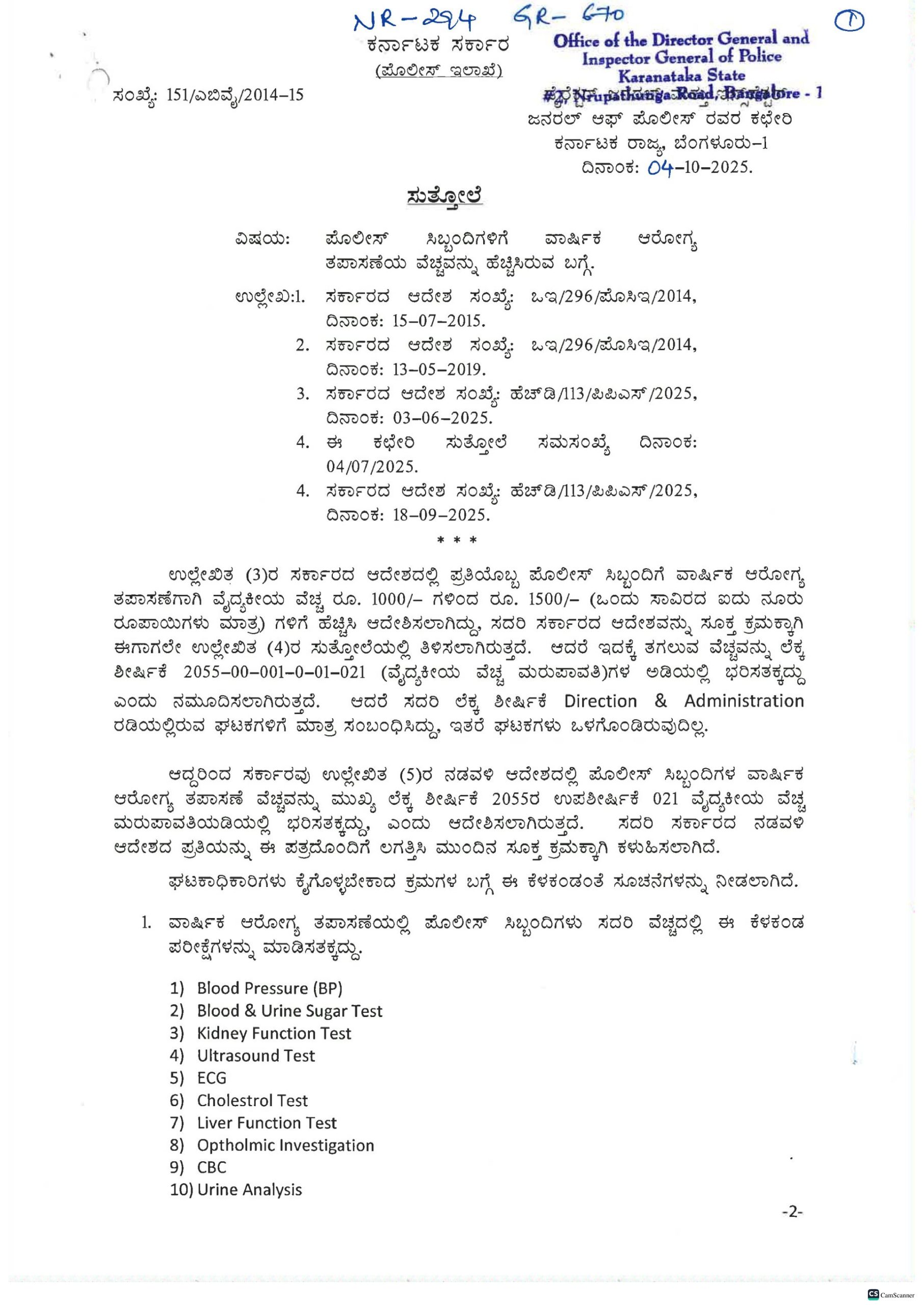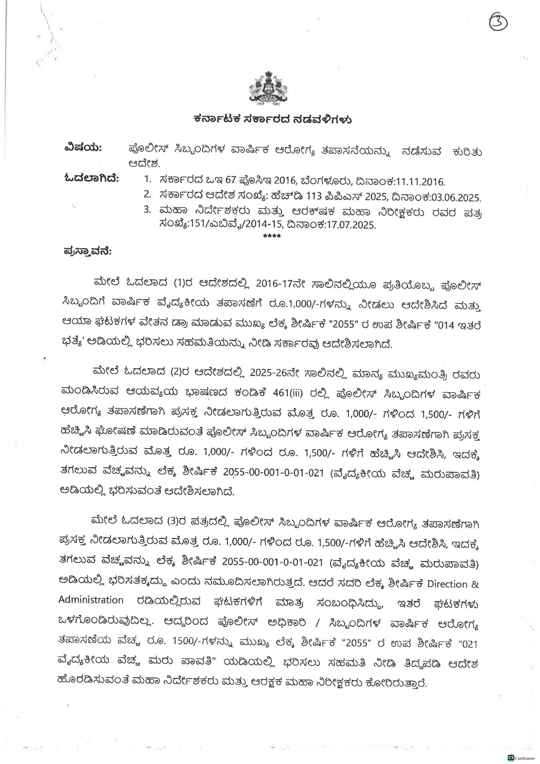 ಈ ಕುರಿತು ಡೈರೆಕ್ಟರ್ ಜನರಲ್ ಮತ್ತು ಇನ್ಸ್ ಪೆಕ್ಟರ್ ಜರಲ್ ಆಫ್ ಪೊಲೀಸ್ ಅವರ ಕಚೇರಿಯಿಂದ ಸುತ್ತೋಲೆ ಹೊರಡಿಸಲಾಗಿದ್ದು, ಪ್ರತಿಯೊಬ್ಬ ಪೊಲೀಸ್ ಸಿಬ್ಬಂದಿಗೆ ವಾರ್ಷಿಕ ಆರೋಗ್ಯ ತಪಾಸಣೆಗಾಗಿ ವೈದ್ಯಕೀಯ ವೆಚ್ಚ ರೂ. 1000/- ಗಳಿಂದ ರೂ. 1500/- (ಒಂದು ಸಾವಿರದ ಐದು ನೂರು ರೂಪಾಯಿಗಳು ಮಾತ್ರ) ಗಳಿಗೆ ಹೆಚ್ಚಿಸಿ ಆದೇಶಿಸಲಾಗಿದ್ದು, ಸದರಿ ಸರ್ಕಾರದ ಆದೇಶವನ್ನು ಸೂಕ್ತ ಕ್ರಮಕ್ಕಾಗಿ ಈಗಾಗಲೇ ಉಲ್ಲೇಖಿತ (4)ರ ಸುತ್ತೋಲೆಯಲ್ಲಿ ತಿಳಿಸಲಾಗಿರುತ್ತದೆ. ಆದರೆ ಇದಕ್ಕೆ ತಗಲುವ ವೆಚ್ಚವನ್ನು ಲೆಕ್ಕ ಶೀರ್ಷಿಕೆ 2055-00-001-0-01-021 (ವೈದ್ಯಕೀಯ ವೆಚ್ಚ ಮರುಪಾವತಿ)ಗಳ ಅಡಿಯಲ್ಲಿ ಭರಿಸತಕ್ಕದ್ದು ಎಂದು ನಮೂದಿಸಲಾಗಿರುತ್ತದೆ. ಆದರೆ ಸದರಿ ಲೆಕ್ಕ ಶೀರ್ಷಿಕೆ Direction & Administration ರಡಿಯಲ್ಲಿರುವ ಘಟಕಗಳಿಗೆ ಮಾತ್ರ ಸಂಬಂಧಿಸಿದ್ದು, ಇತರ ಘಟಕಗಳು ಒಳಗೊಂಡಿರುವುದಿಲ್ಲ.