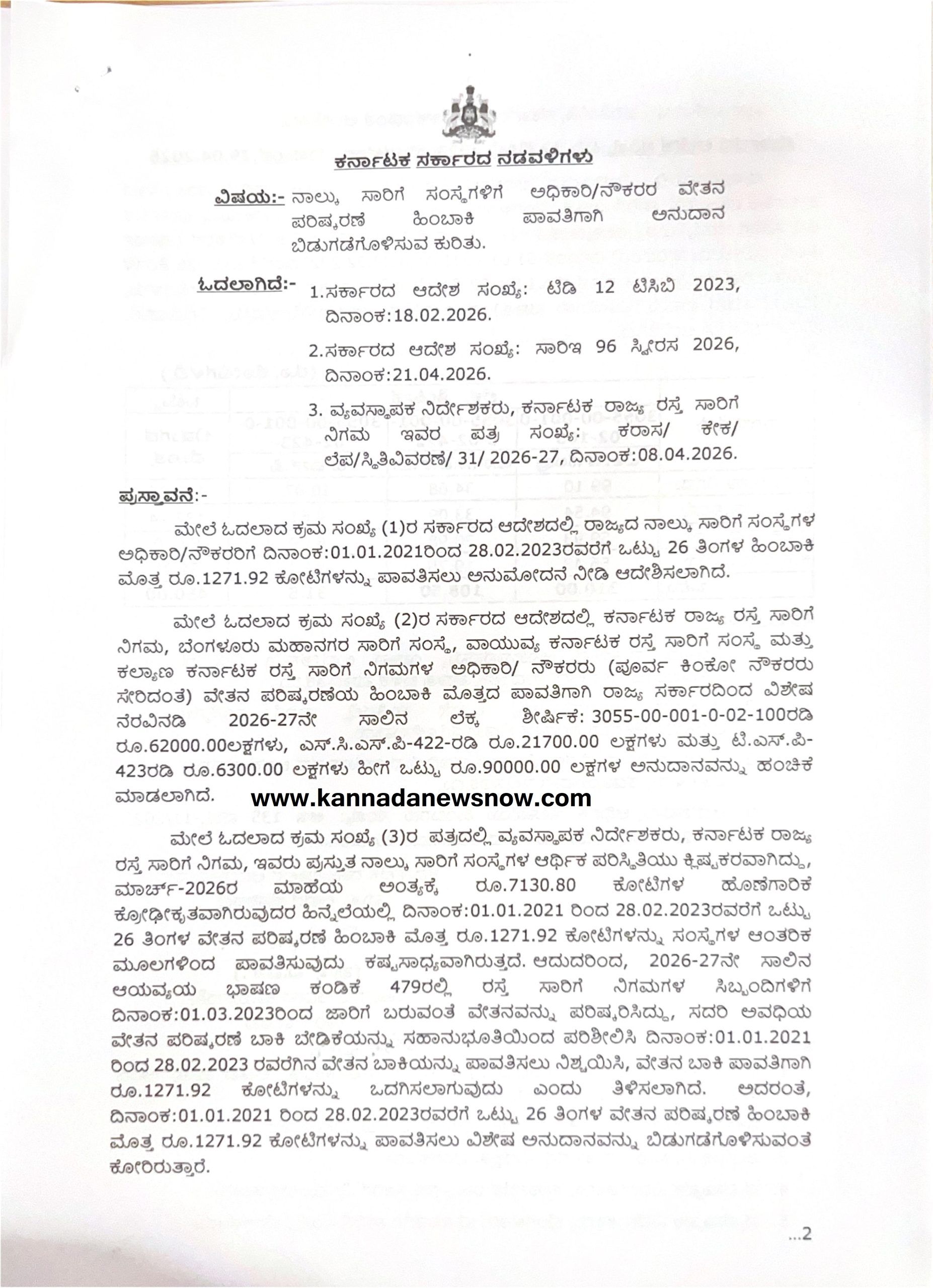 ​ದಿನಾಂಕ 29.04.2026 ರಂದು ಹೊರಡಿಸಲಾದ ಈ ಆದೇಶವು ಸಾರಿಗೆ ನೌಕರರ ಕುಟುಂಬಗಳಲ್ಲಿ ಸಂತಸ ತಂದಿದೆ. ಆರ್ಥಿಕ ಇಲಾಖೆಯ ಸಹಮತಿಯೊಂದಿಗೆ ಹೊರಡಿಸಲಾದ ಈ ಆದೇಶವು, ಸಂಕಷ್ಟದಲ್ಲಿದ್ದ ಸಾರಿಗೆ ನಿಗಮಗಳಿಗೆ ಮತ್ತು ನೌಕರರಿಗೆ ದೊಡ್ಡ ಮಟ್ಟದ ಆರ್ಥಿಕ ನೆರವು ನೀಡಲಿದೆ.