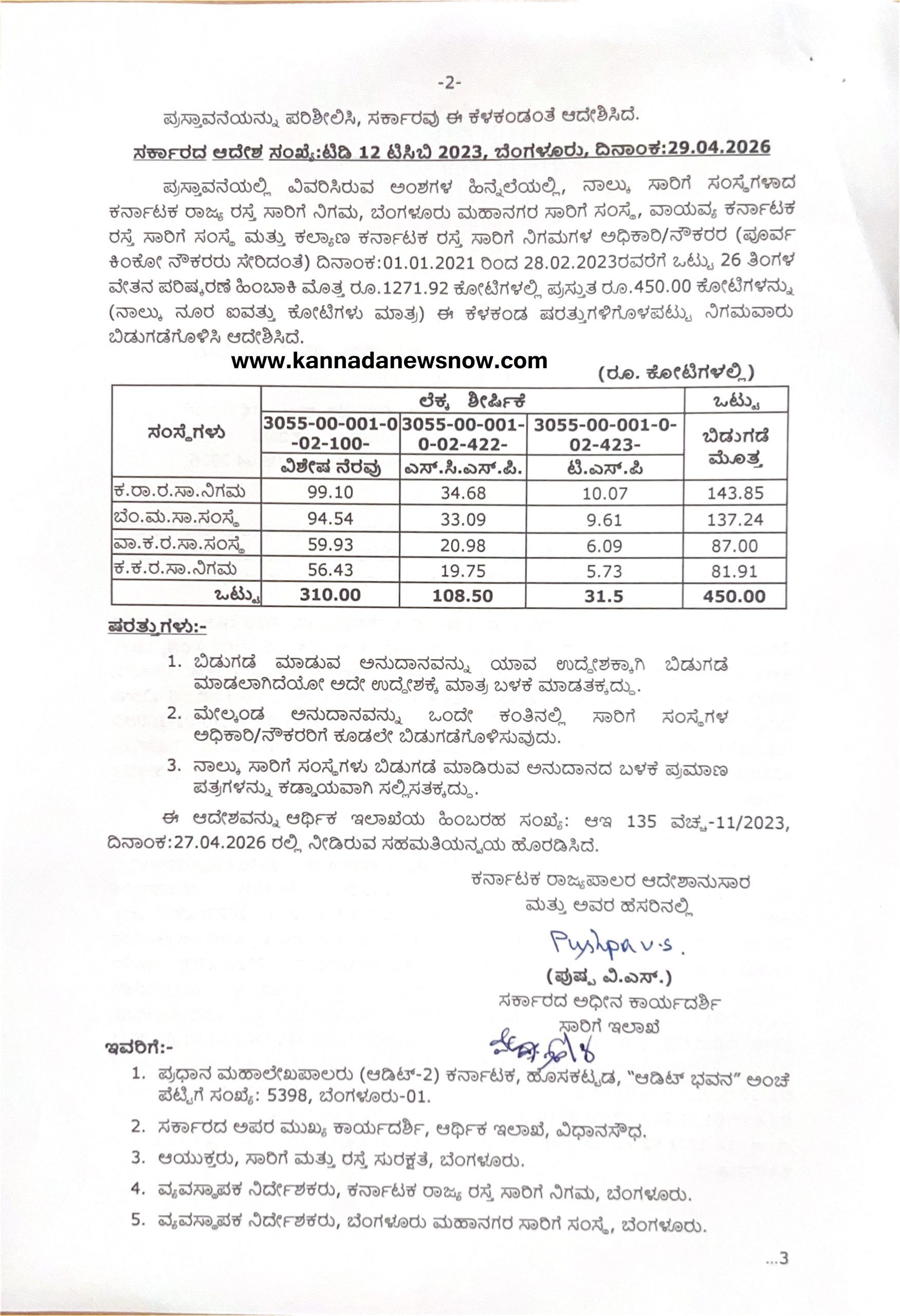 • ​ತಕ್ಷಣದ ಪಾವತಿ: ಬಿಡುಗಡೆಯಾದ ಅನುದಾನವನ್ನು ಸಾರಿಗೆ ಅಧಿಕಾರಿ ಮತ್ತು ನೌಕರರಿಗೆ ಒಂದೇ ಕಂತಿನಲ್ಲಿ ಕೂಡಲೇ ಪಾವತಿಸತಕ್ಕದ್ದು.