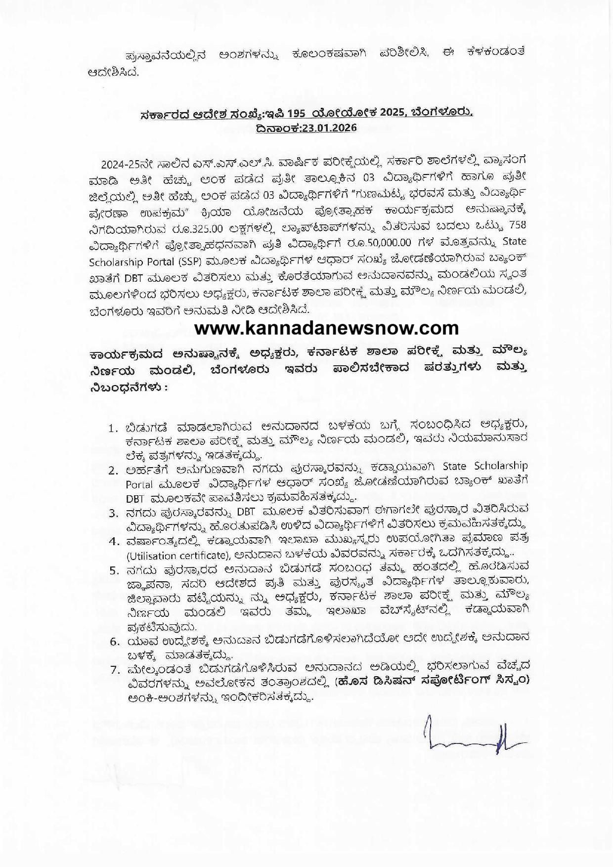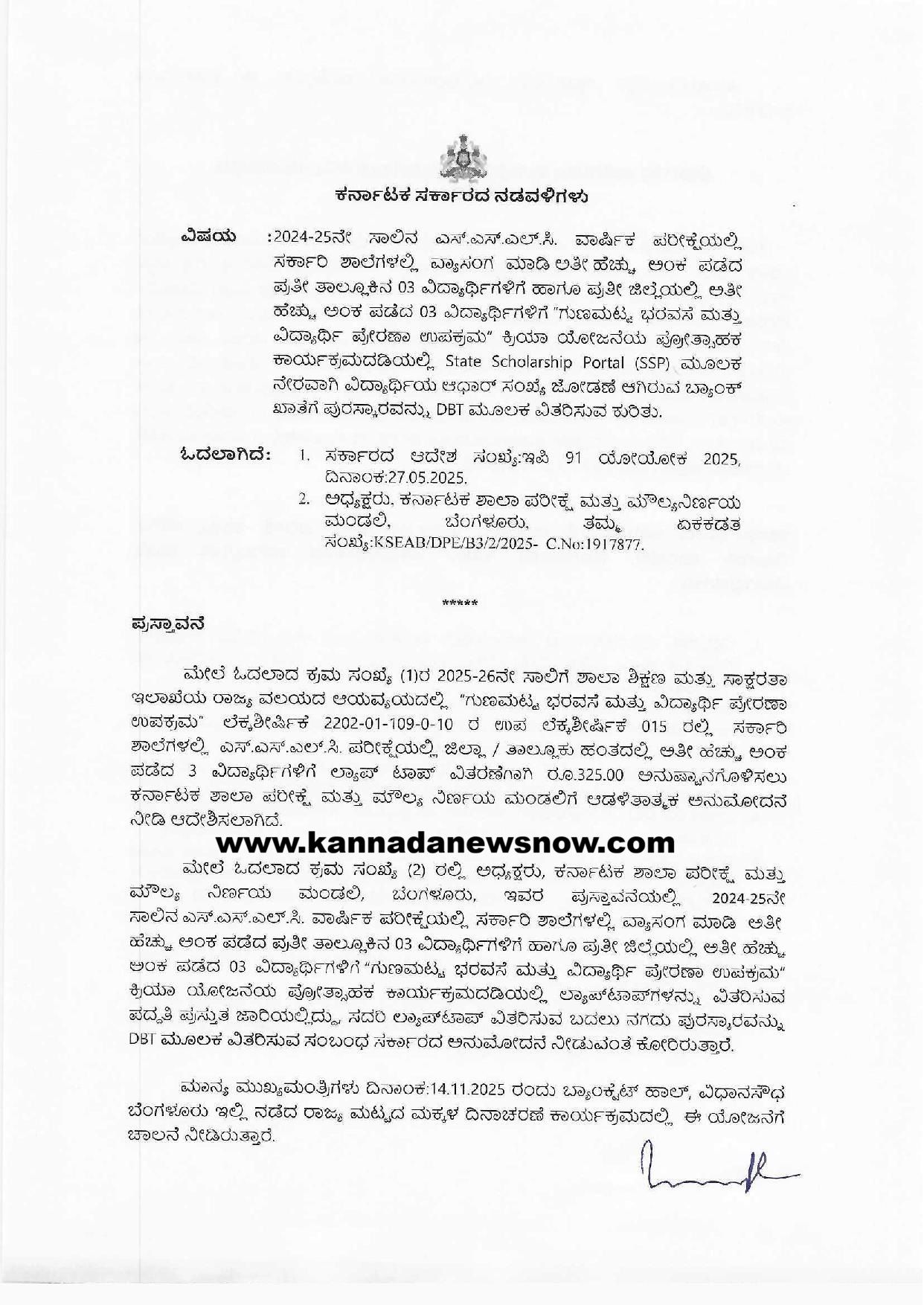 ಈ ಕುರಿತಂತೆ ಶಾಲಾ ಶಿಕ್ಷಣ ಇಲಾಖೆಯ ಸರ್ಕಾರದ ಅಧೀನ ಕಾರ್ಯದರ್ಶಿ ನಡವಳಿಯನ್ನು ಹೊರಡಿಸಿದ್ದಾರೆ. ಅದರಲ್ಲಿ 2025-26ನೇ ಸಾಲಿಗೆ ಶಾಲಾ ಶಿಕ್ಷಣ ಮತ್ತು ಸಾಕ್ಷರತಾ ಇಲಾಖೆಯ ರಾಜ್ಯ ವಲಯದ ಆಯವ್ಯಯದಲ್ಲಿ “ಗುಣಮಟ್ಟ ಭರವಸೆ ಮತ್ತು ವಿದ್ಯಾರ್ಥಿ ಪ್ರೇರಣಾ ಉಪಕ್ರಮ” ಲೆಕ್ಕಶೀರ್ಷಿಕ 2202-01-109-0-10 ರ ಉಪ ಲೆಕ್ಕಶೀರ್ಷಿಕೆ 015 ರಲ್ಲಿ ಸರ್ಕಾರಿ ಶಾಲೆಗಳಲ್ಲಿ ಎಸ್.ಎಸ್.ಎಲ್.ಸಿ. ಪರೀಕ್ಷೆಯಲ್ಲಿ ಜಿಲ್ಲಾ / ತಾಲ್ಲೂಕು ಹಂತದಲ್ಲಿ ಅತೀ ಹೆಚ್ಚು ಅಂಕ ಪಡೆದ 3 ವಿದ್ಯಾರ್ಥಿಗಳಿಗೆ ಲ್ಯಾಪ್ ಟಾಪ್ ವಿತರಣೆಗಾಗಿ ರೂ.325.00 ಅನುಷ್ಠಾನಗೊಳಿಸಲು ಕರ್ನಾಟಕ ಶಾಲಾ ಪರೀಕ್ಷೆ ಮತ್ತು ಮೌಲ್ಯ ನಿರ್ಣಯ ಮಂಡಲಿಗೆ ಆಡಳಿತಾತ್ಮಕ ಅನುಮೋದನೆ ನೀಡಿ ಆದೇಶಿಸಲಾಗಿದೆ.
