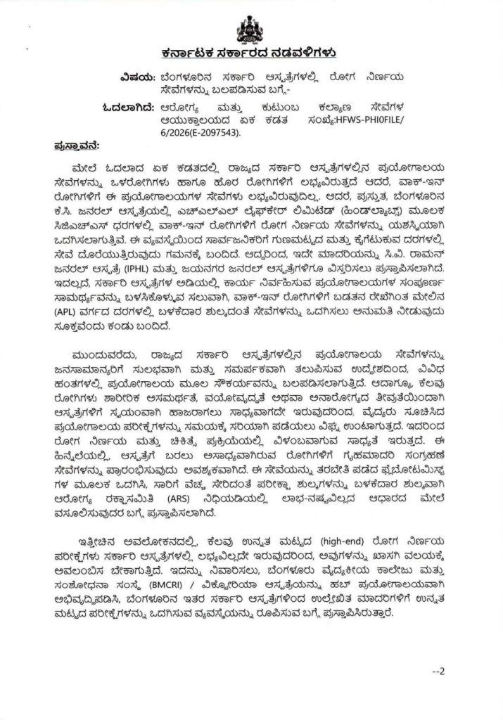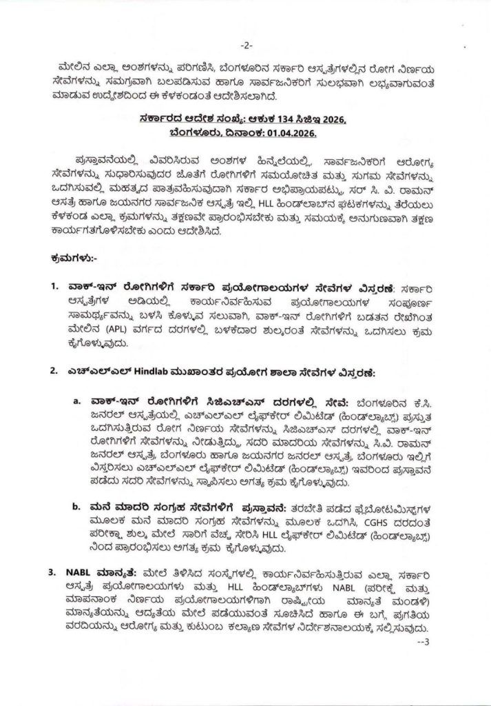 ಪ್ರಸ್ತುತ ಕೆ.ಸಿ. ಜನರಲ್ ಆಸ್ಪತ್ರೆಯಲ್ಲಿ ಎಚ್ಎಲ್ಎಲ್ ಲೈಫ್ಕೇರ್ ಲಿಮಿಟೆಡ್ (ಹಿಂದ್ಲ್ಯಾಬ್ಸ್) ಮೂಲಕ ನೀಡಲಾಗುತ್ತಿರುವ ರೋಗ ನಿರ್ಣಯ ಸೇವೆಗಳನ್ನು ಈಗ ಸರ್ ಸಿ.ವಿ. ರಾಮನ್ ಜನರಲ್ ಆಸ್ಪತ್ರೆ ಮತ್ತು ಜಯನಗರ ಜನರಲ್ ಆಸ್ಪತ್ರೆಗಳಿಗೂ ವಿಸ್ತರಿಸಲಾಗುತ್ತಿದೆ.