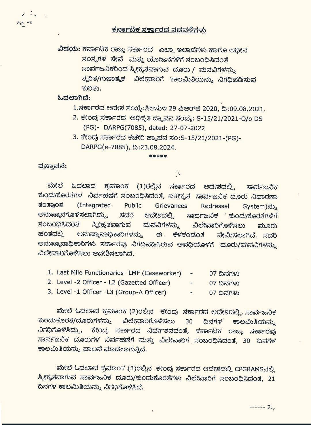 ಮೇಲೆ ಪ್ರಸ್ತಾವನೆಯಲ್ಲಿ ವಿವರಿಸಿರುವ ಅಂಶಗಳ ಹಿನ್ನೆಲೆಯಲ್ಲಿ, ಕೇಂದ್ರ ಸರ್ಕಾರದ ಪರಿಷ್ಕೃತ ಮಾರ್ಗಸೂಚಿಯನ್ವಯ ರಾಜ್ಯದ ವಿವಿಧ ಇಲಾಖೆಗಳು, ಅಧೀನ ಇಲಾಖೆಗಳು, ಸ್ನಾಯತ್ತ ಸಂಸ್ಥೆಗಳು, ನಿಗಮಗಳು, ಮಂಡಳಿಗಳು, ಪ್ರಾಧಿಕಾರಗಳು, ಅನುದಾನಿತ ಸಂಸ್ಥೆಗಳು, ವಿಶ್ವವಿದ್ಯಾಲಯಗಳು ಹಾಗೂ ಸಾರ್ವಜನಿಕ ಉದ್ದಿಮೆಗಳು ಸೇರಿದಂತೆ ಎಲ್ಲಾ ಸರ್ಕಾರಿ, ಸರ್ಕಾರಿ ಅನುದಾನಿತ ಹಾಗೂ ಅರೆಸರ್ಕಾರಿ ಸಂಸ್ಥೆಗಳಲ್ಲಿನ ಸೇವೆಗಳು ಹಾಗೂ ಯೋಜನೆಗಳಿಗೆ ಸಂಬಂಧಿಸಿದಂತೆ IPGRS ಹಾಗೂ CPGRAMSನಲ್ಲಿ ಸ್ವೀಕೃತವಾಗುವ ಸಾರ್ವಜನಿಕ ಕುಂದುಕೊರತೆಗಳನ್ನು ಹಾಗೂ ಮನವಿಗಳನ್ನು ತ್ವರಿತವಾಗಿ, ಗುಣಾತ್ಮಕವಾಗಿ ಹಾಗೂ ನಾಗರೀಕರಿಗೆ ತೃಪ್ತಿಕರವಾಗಿ ಆಯಾ ವಿಷಯಗಳ ಬಗೆಗಿನ ಕಾಯ್ದೆ, ನಿಯಮ ಹಾಗೂ ಸರ್ಕಾರಿ ಆದೇಶೆಗಳನುಸಾರ ಪರಿಣಾಮಕಾರಿಯಾಗಿ ವಿಲೇಗೊಳಿಸಲು ಈ ಕೆಳಕಂಡಂತೆ 21 ದಿನಗಳ ಕಾಲಮಿತಿಯನ್ನು ನಿಗದಿಗೊಳಿಸಿ ಆದೇಶಿಸಿದ. ಗರಿಷ್ಠ