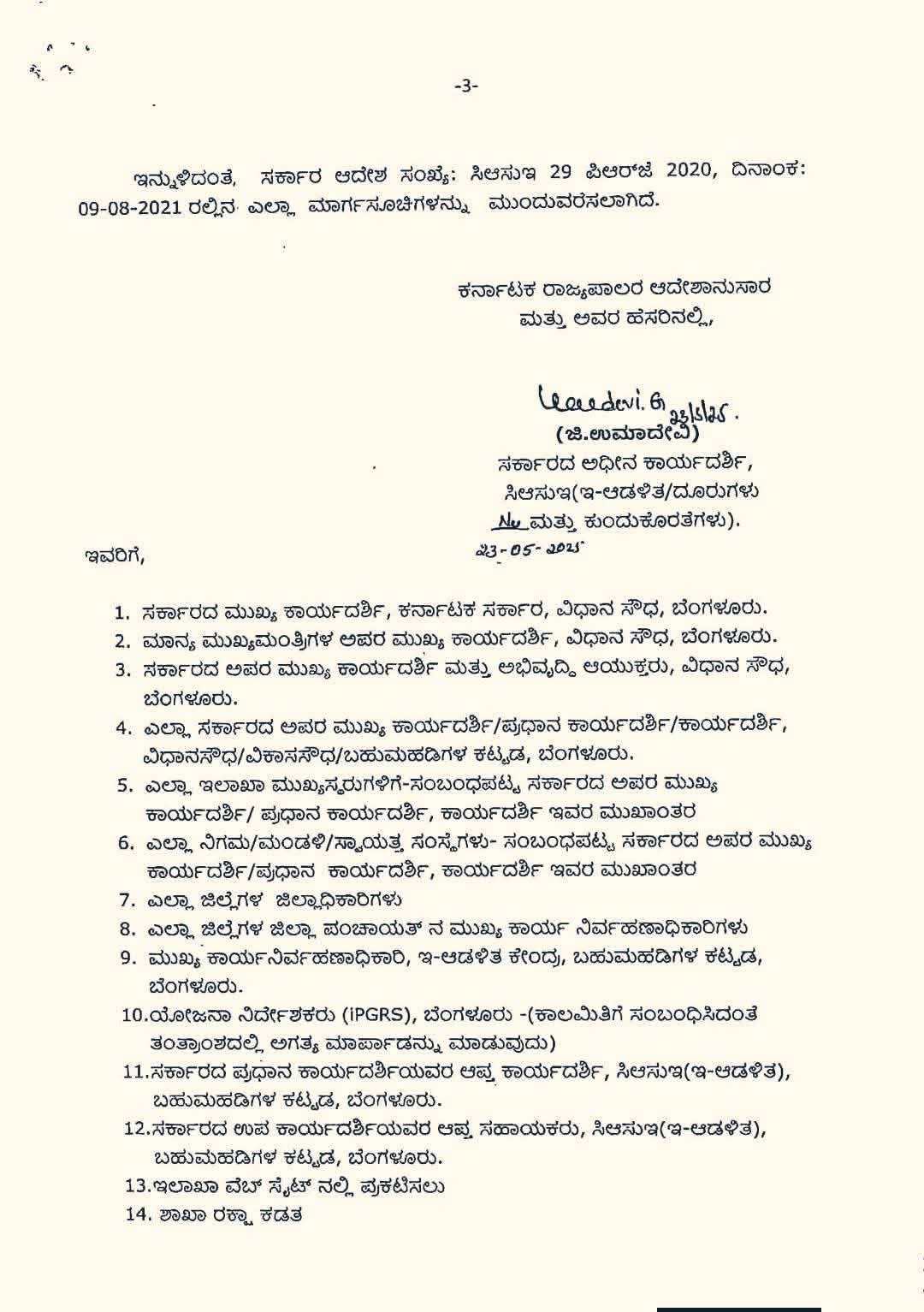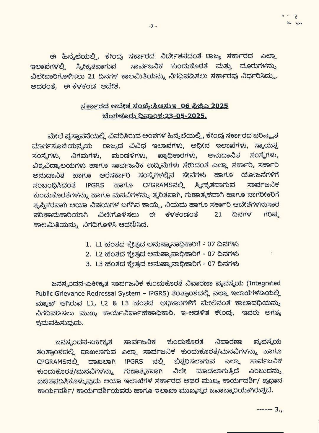 ಜನಸ್ಪಂದನ-ಏಕೀಕೃತ ಸಾರ್ವಜನಿಕ ಕುಂದುಕೊರತೆ ನಿವಾರಣಾ ವ್ಯವಸ್ಥೆಯ (Integrated Public Grievance Redressal System – iPGRS) ಮ್ಯಾಪ್ ಆಗಿರುವ L1, L2 & L3 ಹಂತದ ಅಧಿಕಾರಿಗಳಿಗೆ ಮೇಲಿನಂತೆ ಕಾಲಾವಧಿಯನ್ನು ನಿಗದಿಪಡಿಸಲು ಮುಖ್ಯ ಕಾರ್ಯನಿರ್ವಾಹಣಾಧಿಕಾರಿ, ಇ-ಆಡಳಿತ ಕೇಂದ್ರ, ಇವರು ಅಗತ್ಯ ಕ್ರಮವಹಿಸುವುದು.