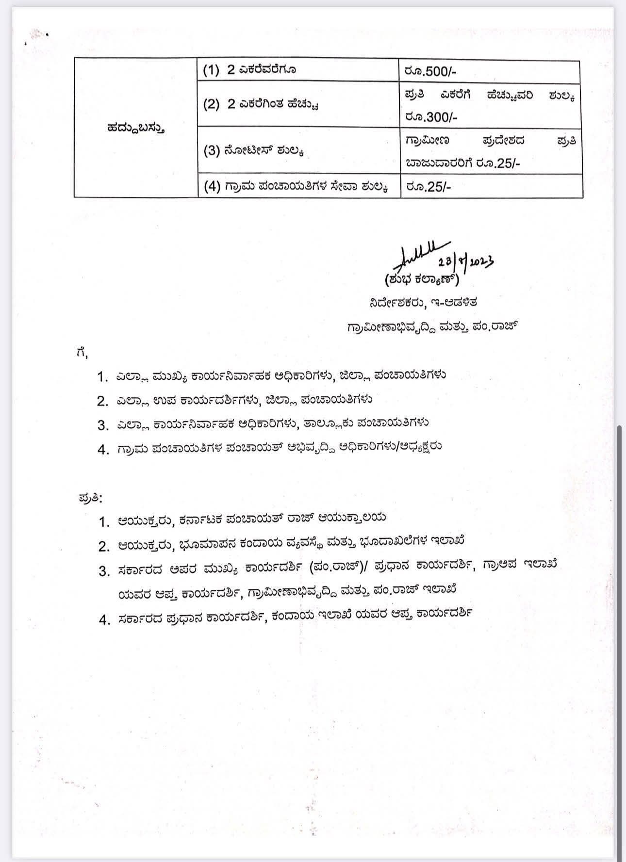 ಅದರಂತೆ, ಗ್ರಾಮ ಪಂಚಾಯತಿಗಳ ಬಾಪೂಜಿ ಸೇವಾ ಕೇಂದ್ರಗಳಲ್ಲಿ “11 ಇ ನಕ್ಷೆ”, “ತತ್ಕಾಲ್ ಪೋಡಿ”, “ಭೂ ಪರಿವರ್ತನೆಗಾಗಿ ಅರ್ಜಿ” ಮತ್ತು “ಹದ್ದುಬಸ್ತು” ಸೇವೆಗಳಿಗೆ ಅರ್ಜಿಗಳನ್ನು ಸ್ವೀಕರಿಸಿ, ಉಲ್ಲೇಖ 1 ಮತ್ತು 2 ರ ಆದೇಶಗಳಂತೆ, ಈ ಕೆಳಗಿನ ಪಟ್ಟಿಯಲ್ಲಿ ತಿಳಿಸಲಾಗಿರುವ ಅರ್ಜಿ ಶುಲ್ಕವನ್ನು ಪಡೆಯಲು ಆದೇಶಿಸಿದೆ.