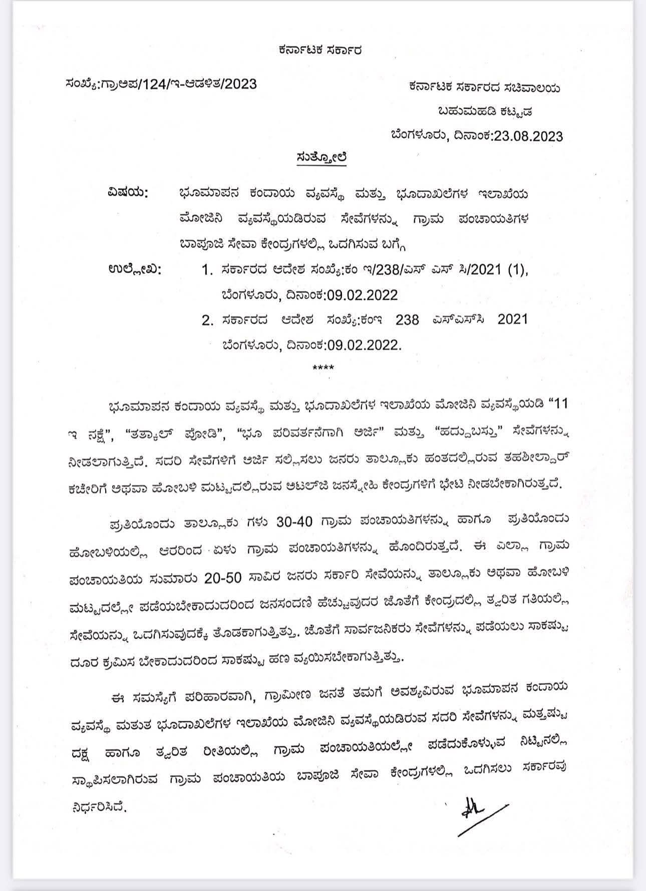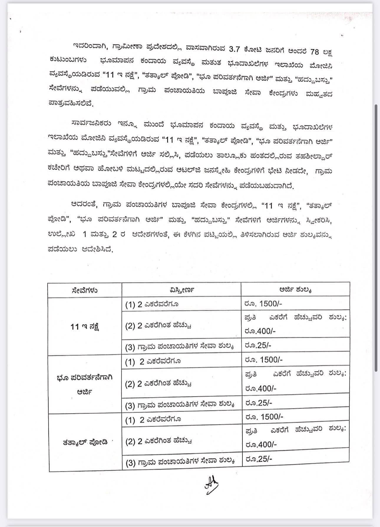ಅದರಂತೆ, ಗ್ರಾಮ ಪಂಚಾಯತಿಗಳ ಬಾಪೂಜಿ ಸೇವಾ ಕೇಂದ್ರಗಳಲ್ಲಿ “11 ಇ ನಕ್ಷೆ”, “ತತ್ಕಾಲ್ ಪೋಡಿ”, “ಭೂ ಪರಿವರ್ತನೆಗಾಗಿ ಅರ್ಜಿ” ಮತ್ತು “ಹದ್ದುಬಸ್ತು” ಸೇವೆಗಳಿಗೆ ಅರ್ಜಿಗಳನ್ನು ಸ್ವೀಕರಿಸಿ, ಉಲ್ಲೇಖ 1 ಮತ್ತು 2 ರ ಆದೇಶಗಳಂತೆ, ಈ ಕೆಳಗಿನ ಪಟ್ಟಿಯಲ್ಲಿ ತಿಳಿಸಲಾಗಿರುವ ಅರ್ಜಿ ಶುಲ್ಕವನ್ನು ಪಡೆಯಲು ಆದೇಶಿಸಿದೆ.