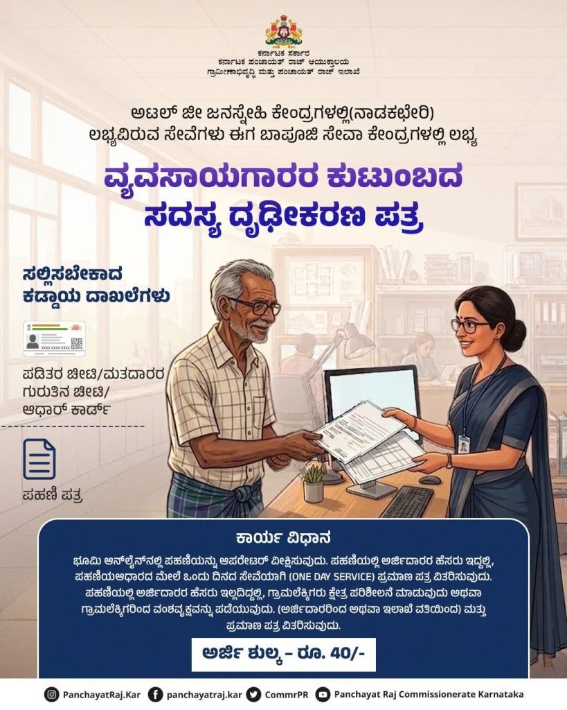 ಅಗತ್ಯ ದಾಖಲೆಗಳು: ಪಡಿತರ ಚೀಟಿ/ಮತದಾರರ ಗುರುತಿನ ಚೀಟಿ/ಆಧಾರ್ ಕಾರ್ಡ್ ಹಾಗೂ ಪಹಣಿ ಪತ್ರ.