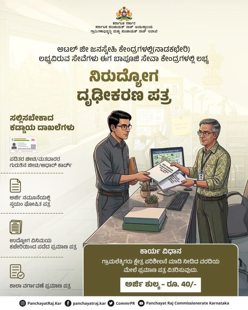 ರಾಜ್ಯದ ಗ್ರಾಮೀಣ ಜನತೆಗೆ ಗುಡ್ ನ್ಯೂಸ್ : ಬಾಪೂಜಿ ಸೇವಾ ಕೇಂದ್ರಗಳಲ್ಲಿ ಸಿಗಲಿದೆ `ನಿರುದ್ಯೋಗ ದೃಢೀಕರಣ’ ಸೇರಿ ಈ ಎಲ್ಲಾ ದಾಖಲೆಗಳು.!