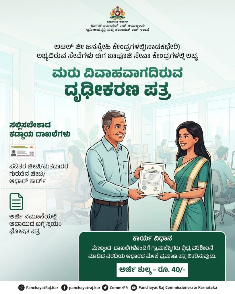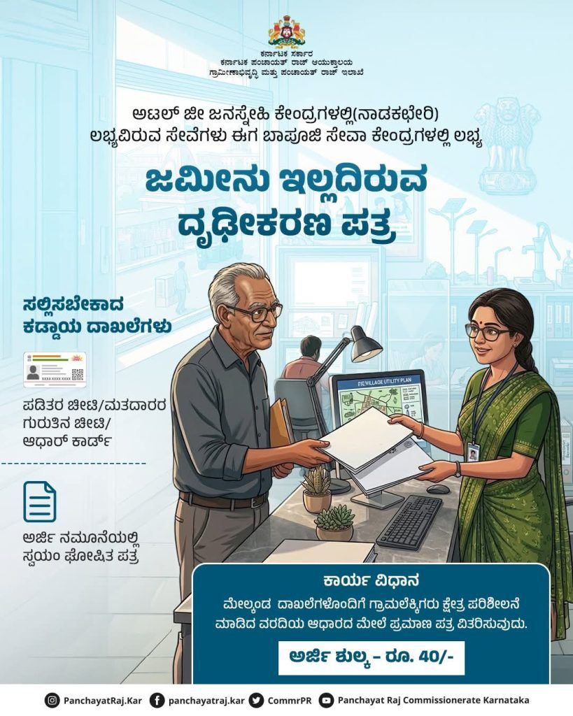 ಬೆಂಗಳೂರು: ರಾಜ್ಯದ ನಾಗರಿಕರಿಗೆ ಸರ್ಕಾರವು ಸಿಹಿ ಸುದ್ದಿಯೊಂದನ್ನು ನೀಡಿದೆ. ಜಾತಿ, ಆದಾಯ ಹಾಗೂ ಇನ್ನಿತರ ಪ್ರಮುಖ ಪ್ರಮಾಣ ಪತ್ರಗಳನ್ನು ಪಡೆಯಲು ಇನ್ನು ಮುಂದೆ ತಾಲ್ಲೂಕು ಕೇಂದ್ರಗಳ ನಾಡಕಚೇರಿಗಳಿಗೆ (Atalji Janasnehi Kendra) ಅಲೆಯುವ ಅಗತ್ಯವಿಲ್ಲ. ಸಾರ್ವಜನಿಕರ ಸಮಯ ಮತ್ತು ಹಣ ಉಳಿಸುವ ಉದ್ದೇಶದಿಂದ, ಎಲ್ಲಾ ಗ್ರಾಮ ಪಂಚಾಯತಿಗಳಲ್ಲಿರುವ ‘ಬಾಪೂಜಿ ಸೇವಾ ಕೇಂದ್ರ’ಗಳಲ್ಲೇ ಈ ಸೇವೆಗಳನ್ನು ಲಭ್ಯವಾಗುವಂತೆ ಮಾಡಲಾಗಿದೆ.
