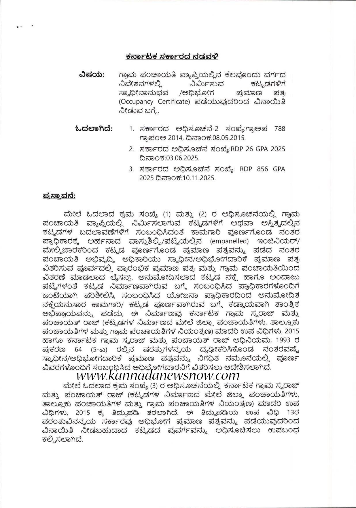 ಕರ್ನಾಟಕ ಗ್ರಾಮ ಸ್ವರಾಜ್ ಮತ್ತು ಪಂಚಾಯತ್ ರಾಜ್ (ಕಟ್ಟಡಗಳ ನಿರ್ಮಾಣದ ಮೇಲೆ ಜಿಲ್ಲಾ ಪಂಚಾಯತಿಗಳು, ತಾಲ್ಲೂಕು ಪಂಚಾಯತಿಗಳ ಮತ್ತು ಗ್ರಾಮ ಪಂಚಾಯತಿಗಳ ನಿಯಂತ್ರಣ) (ಎರಡನೇ ತಿದ್ದುಪಡಿ) ಮಾದರಿ ಉಪ ವಿಧಿಗಳು, 2025ರ ಉಪ ವಿಧಿ 13ರ ಅವಕಾಶ ಹಾಗೂ ಸ್ವಾಧೀನಾನುಭವ ಪ್ರಮಾಣ ಪತ್ರ ನೀಡುವ ಪ್ರಕ್ರಿಯೆಯು ಸ್ಥಳ ಪರಿಶೀಲನೆ, ನಿರ್ಮಾಣ ಮಾಡಿರುವ ಕಟ್ಟಡ ಹಾಗೂ ಅನುಮೋದಿತ ಕಟ್ಟಡ ನಕ್ಷೆಯ ತುಲನಾತ್ಮಕ ಪರಿಶೀಲನೆ ಮುಂತಾದವುಗಳನ್ನು ಒಳಗೊಂಡಿರುವುದರಿಂದ, ಸ್ಥಳೀಯ ಪ್ರಾಧಿಕಾರದ ಅಧಿಕಾರಿಗಳಿಗೆ ಹೆಚ್ಚಿನ ಕೆಲಸದ ಹೊರೆ ಉಂಟಾಗುತ್ತಿದೆ. ಇದರಿಂದಾಗಿ ಸಾರ್ವಜನಿಕರಿಗೆ ಸಕಾಲದಲ್ಲಿ ಸೇವೆ ನೀಡುವಲ್ಲಿ ವಿಳಂಬವಾಗುವ ಸಾಧ್ಯತೆಗಳಿದ್ದು, ಸಾರ್ವಜನಿಕ ಅನುಕೂಲವನ್ನು ಗಮನದಲ್ಲಿರಿಸಿಕೊಂಡು ಮಾದರಿ ಉಪ ವಿಧಿಗಳ ಉಪ ವಿಧಿ 13ರಲ್ಲಿ ಸರ್ಕಾರಕ್ಕಿರುವ ಅಧಿಕಾರದಂತೆ 1,200 ಚದರ ಅಡಿ ವಿಸ್ತೀರ್ಣದವರೆಗಿನ ನಿವೇಶನಗಳಲ್ಲಿ ನಕ್ಷೆ ಮಂಜೂರಾತಿ ಪಡೆಯದೆ ನಿರ್ಮಿಸಲಾಗಿರುವ ನೆಲ +2 ಅಂತಸ್ತು ಅಥವಾ ಸ್ಟೀಲ್ಸ್ +3 ಅಂತಸ್ತಿನವರೆಗಿನ ವಸತಿ ಕಟ್ಟಡಗಳಿಗೆ ಸ್ವಾಧೀನಾನುಭವ / ಅಧಿಭೋಗ ಪ್ರಮಾಣ ಪತ್ರ (Occupancy Certificate) ಪಡೆಯಲು ಸಾರ್ವಜನಿಕರಿಗೆ ವಿನಾಯಿತಿ ನೀಡುವುದರಿಂದ ಸಾರ್ವಜನಿಕರಿಗೆ ಸಕಾಲದಲ್ಲಿ ಸೇವೆ ಒದಗಿಸಲು ಸಹಕಾರಿಯಾದಂತಾಗುತ್ತದೆ ಎಂಬುವುದನ್ನು ಮನಗಂಡು ಆದೇಶ ಹೊರಡಿಸಲು ನಿರ್ಧರಿಸಿದೆ. ಅದರಂತೆ ಈ ಕೆಳಕಂಡ ಆದೇಶಿದ್ದಾರೆ.