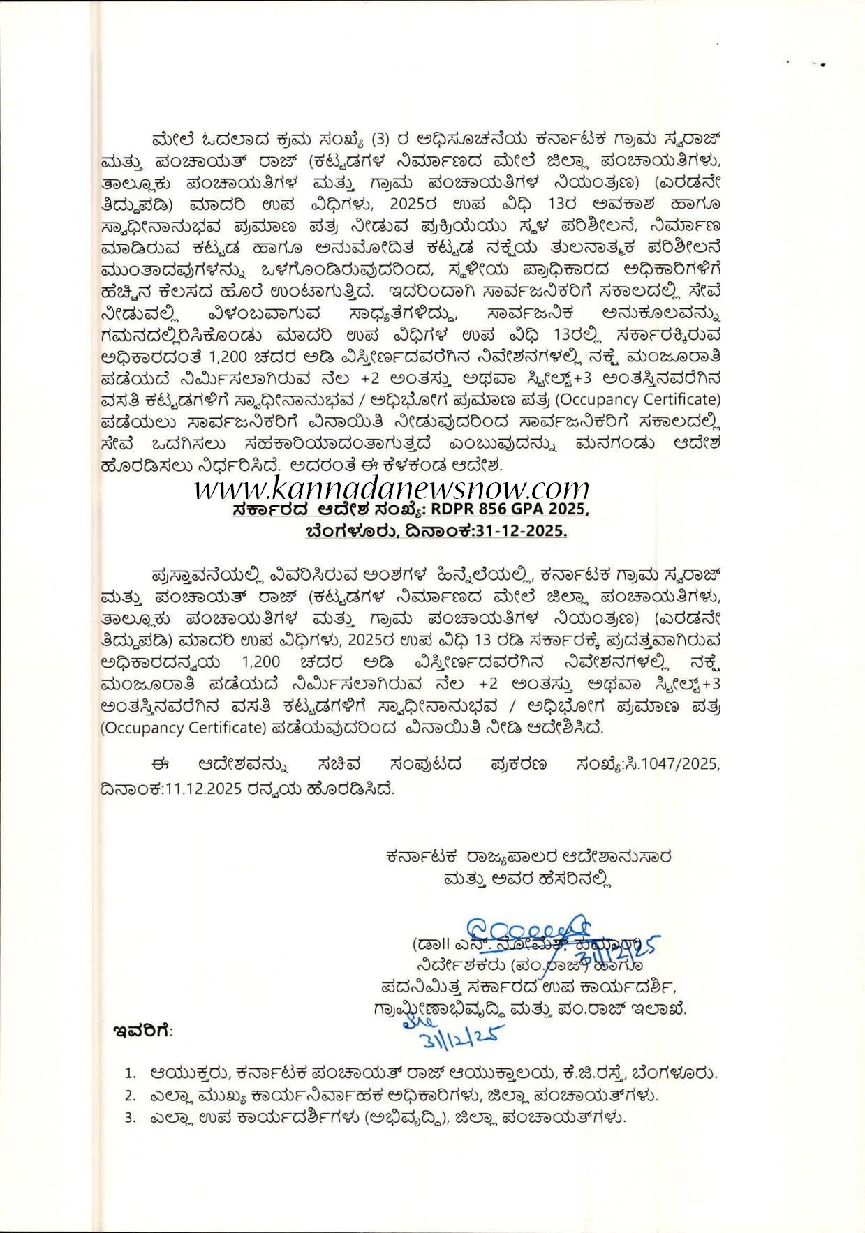 ಪುಸ್ತಾವನೆಯಲ್ಲಿ ವಿವರಿಸಿರುವ ಅಂಶಗಳ ಹಿನ್ನೆಲೆಯಲ್ಲಿ, ಕರ್ನಾಟಕ ಗ್ರಾಮ ಸ್ವರಾಜ್ ಮತ್ತು ಪಂಚಾಯತ್ ರಾಜ್ (ಕಟ್ಟಡಗಳ ನಿರ್ಮಾಣದ ಮೇಲೆ ಜಿಲ್ಲಾ ಪಂಚಾಯತಿಗಳು, ತಾಲ್ಲೂಕು ಪಂಚಾಯತಿಗಳ ಮತ್ತು ಗ್ರಾಮ ಪಂಚಾಯತಿಗಳ ನಿಯಂತ್ರಣ) (ಎರಡನೇ ತಿದ್ದುಪಡಿ) ಮಾದರಿ ಉಪ ವಿಧಿಗಳು, 2025ರ ಉಪ ವಿಧಿ 13 ರಡಿ ಸರ್ಕಾರಕ್ಕೆ ಪುದತ್ತವಾಗಿರುವ ಅಧಿಕಾರದನ್ವಯ 1,200 ಚದರ ಅಡಿ ವಿಸ್ತೀರ್ಣದವರೆಗಿನ ನಿವೇಶನಗಳಲ್ಲಿ ನಕ್ಷೆ ಮಂಜೂರಾತಿ ಪಡೆಯದೆ ನಿರ್ಮಿಸಲಾಗಿರುವ ನೆಲ +2 ಅಂತಸ್ತು ಅಥವಾ ಸ್ಟೀಲ್ +3 ಅಂತಸ್ತಿನವರೆಗಿನ ವಸತಿ ಕಟ್ಟಡಗಳಿಗೆ ಸ್ವಾಧೀನಾನುಭವ / ಅಧಿಭೋಗ ಪ್ರಮಾಣ ಪತ್ರ (Occupancy Certificate) ಪಡೆಯವುದರಿಂದ ವಿನಾಯಿತಿ ನೀಡಿ ಆದೇಶಿಸಿದೆ. ಈ ಆದೇಶವನ್ನು ಸಚಿವ ಸಂಪುಟದ ಪ್ರಕರಣ ಸಂಖ್ಯೆ:ಸಿ.1047/2025, ದಿನಾಂಕ:11.12.2025 ರನ್ವಯ ಹೊರಡಿಸಿದೆ ಎಂದು ಹೇಳಿದ್ದಾರೆ.