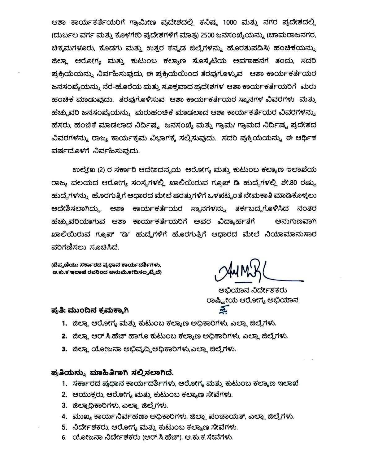 ಹೆಚ್ಚುವರಿ ಕಾರ್ಯಕರ್ತೆಯರಿಗೆ ಉದ್ಯೋಗ ಭದ್ರತೆ: ಹುದ್ದೆಗಳ ತರ್ಕಬದ್ಧಗೊಳಿಸುವಿಕೆಯಿಂದ (Rationalization) ಯಾವ ಕಾರ್ಯಕರ್ತೆಯರು ಹೆಚ್ಚುವರಿಯಾಗುತ್ತಾರೋ, ಅಂತಹವರನ್ನು ಅವರ ವಿದ್ಯಾರ್ಹತೆಗೆ ಅನುಗುಣವಾಗಿ ಆರೋಗ್ಯ ಇಲಾಖೆಯ ಗ್ರೂಪ್-ಡಿ ಹುದ್ದೆಗಳಿಗೆ ಹೊರಗುತ್ತಿಗೆ ಆಧಾರದ ಮೇಲೆ ಪರಿಗಣಿಸಲು ಸೂಚಿಸಲಾಗಿದೆ.