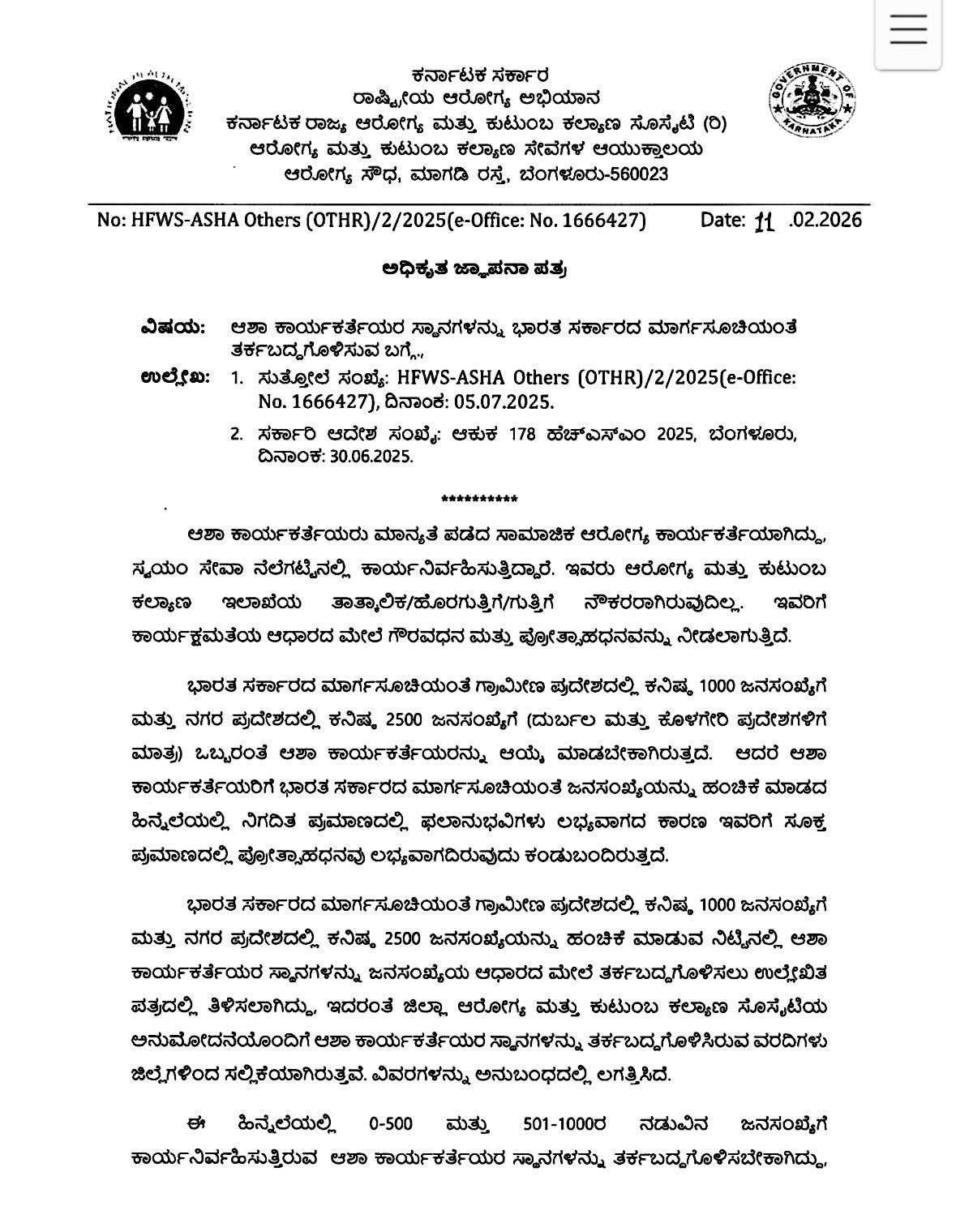 ರಾಷ್ಟ್ರೀಯ ಆರೋಗ್ಯ ಅಭಿಯಾನದ (NHM) ಅಭಿಯಾನ ನಿರ್ದೇಶಕರು ಹೊರಡಿಸಿರುವ ಈ ಆದೇಶದನ್ವಯ, ಜಿಲ್ಲಾ ಆರೋಗ್ಯ ಮತ್ತು ಕುಟುಂಬ ಕಲ್ಯಾಣ ಸೊಸೈಟಿಗಳು ಈ ಪ್ರಕ್ರಿಯೆಯನ್ನು ಪ್ರಸಕ್ತ ಆರ್ಥಿಕ ವರ್ಷದೊಳಗೆ ಪೂರ್ಣಗೊಳಿಸಿ ವರದಿ ಸಲ್ಲಿಸಬೇಕಿದೆ.