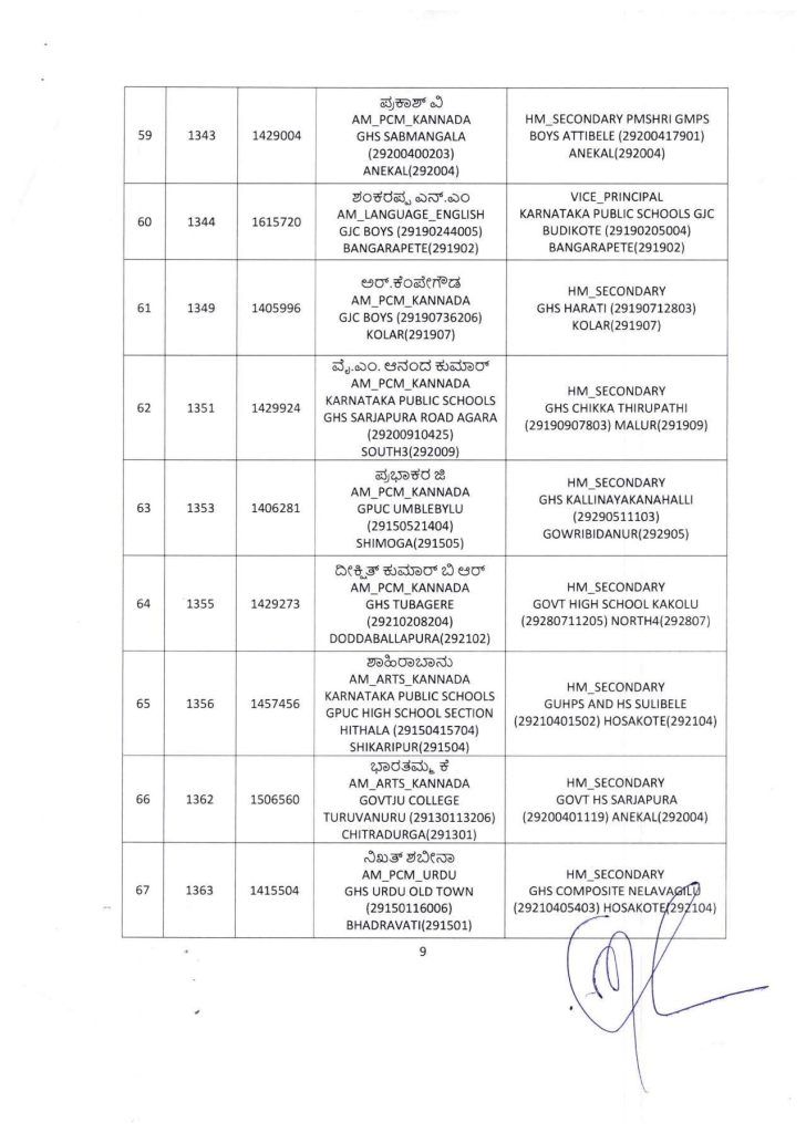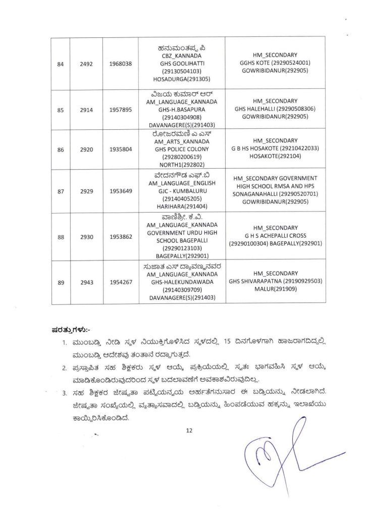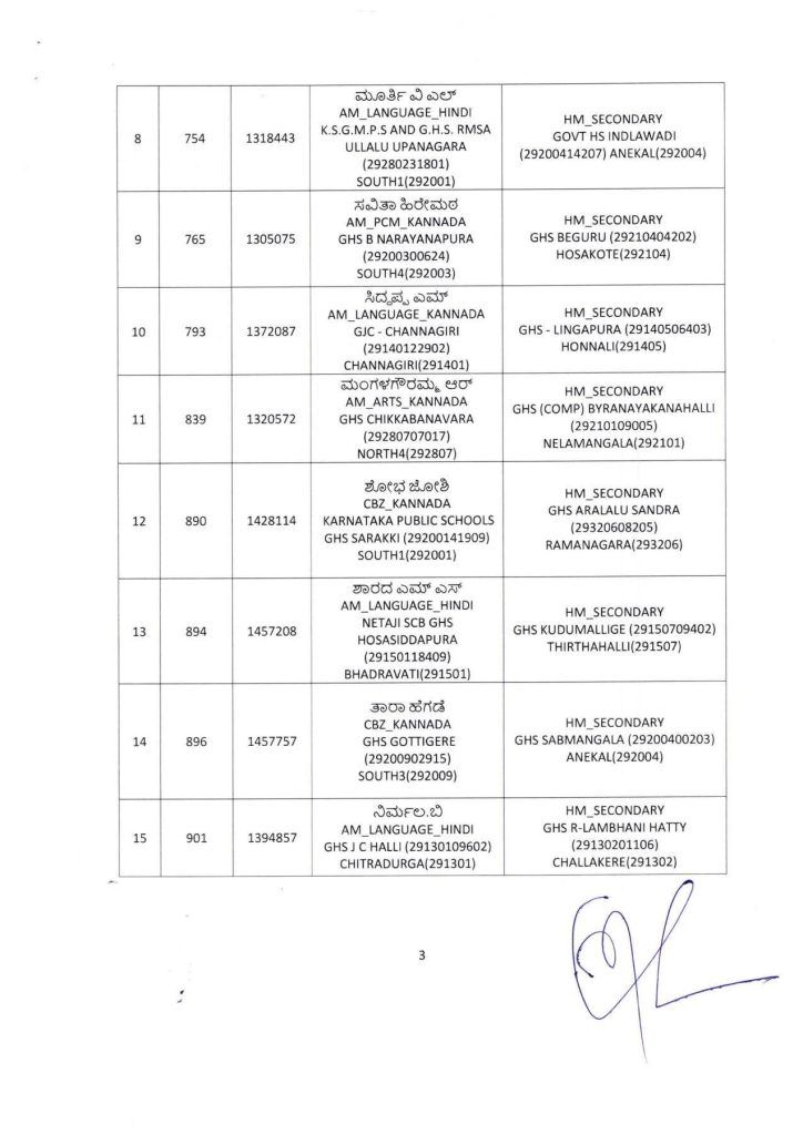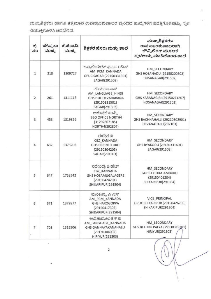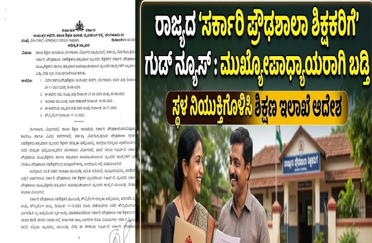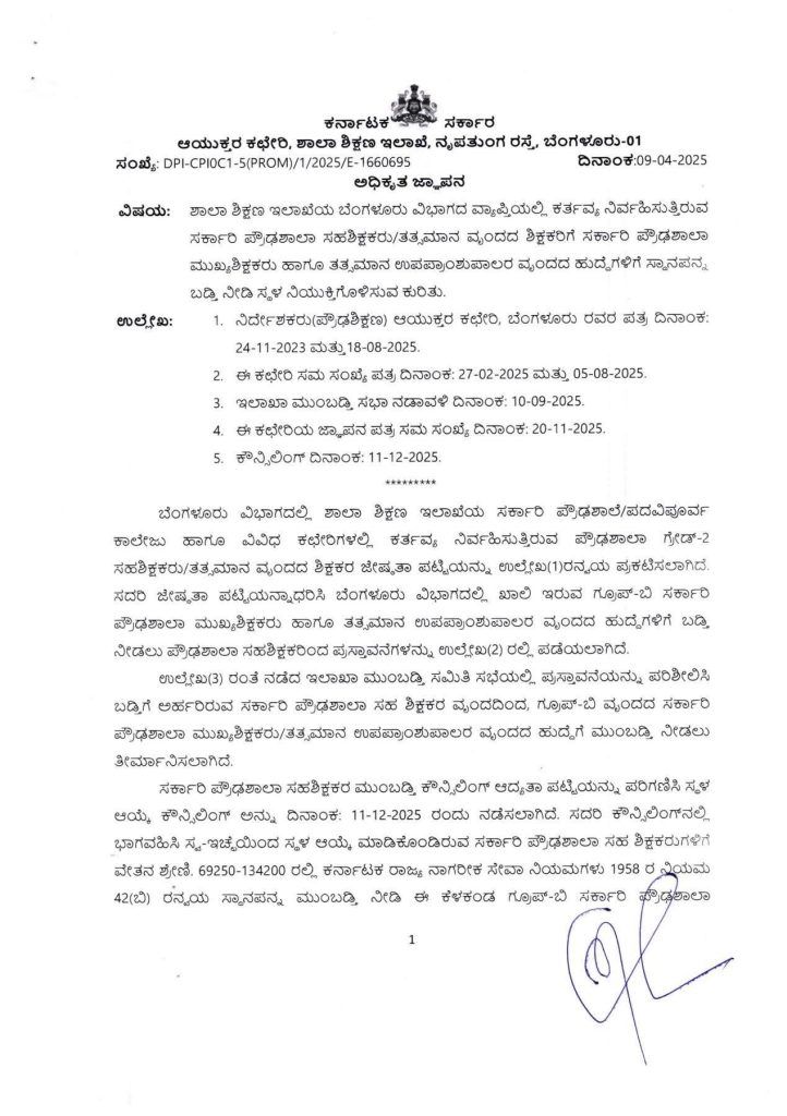 ಸರ್ಕಾರಿ ಪ್ರೌಢಶಾಲಾ ಸಹಶಿಕ್ಷಕರ ಮುಂಬಡ್ತಿ ಕೌನ್ಸಿಲಿಂಗ್ ಆದ್ಯತಾ ಪಟ್ಟಿಯನ್ನು ಪರಿಗಣಿಸಿ ಸ್ಥಳ ಆಯ್ಕೆ ಕೌನ್ಸಿಲಿಂಗ್ ಅನ್ನು ದಿನಾಂಕ: 11-12-2025 ರಂದು ನಡೆಸಲಾಗಿದೆ. ಸದರಿ ಕೌನ್ಸಿಲಿಂಗ್‌ನಲ್ಲಿ ಭಾಗವಹಿಸಿ ಸ್ವ-ಇಚ್ಛೆಯಿಂದ ಸ್ಥಳ ಆಯ್ಕೆ ಮಾಡಿಕೊಂಡಿರುವ ಸರ್ಕಾರಿ ಪ್ರೌಢಶಾಲಾ ಸಹ ಶಿಕ್ಷಕರುಗಳಿಗೆ ವೇತನ ಶ್ರೇಣಿ. 69250-134200 ರಲ್ಲಿ ಕರ್ನಾಟಕ ರಾಜ್ಯ ನಾಗರೀಕ ಸೇವಾ ನಿಯಮಗಳು 1958 ರ ನಿಯಮ 42(ಬಿ) ರನ್ವಯ ಸ್ಥಾನಪನ್ನ ಮುಂಬಡ್ತಿ ನೀಡಿ ಈ ಕೆಳಕಂಡ ಗ್ರೂಪ್-ಬಿ ಸರ್ಕಾರಿ ಪ್ರೌಢಶಾಲಾ ಮುಖ್ಯಶಿಕ್ಷಕರು ಹಾಗೂ ತತ್ಸಮಾನ ಉಪಪ್ರಾಂಶುಪಾಲರ ವೃಂದದ ಹುದ್ದೆಗಳಿಗೆ ಷರತ್ತಿಗೊಳಪಟ್ಟು ಸ್ಥಳ ನಿಯುಕ್ತಿಗೊಳಿಸಿ ಆದೇಶಿಸಿದೆ.