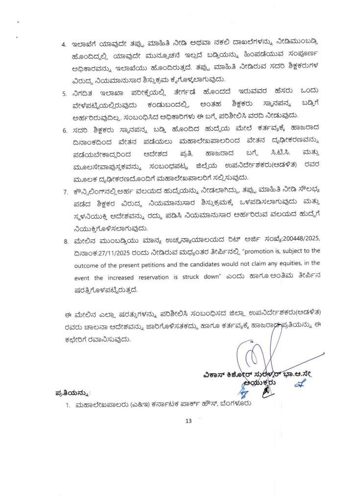 ಆಯುಕ್ತರ ಕಚೇರಿ, ಶಾಲಾ ಶಿಕ್ಷಣ ಇಲಾಖೆ ಹೊರಡಿಸಿರುವ ಈ ಆದೇಶದನ್ವಯ, 2025ರ ಸೆಪ್ಟೆಂಬರ್‌ನಲ್ಲಿ ನಡೆದ ಇಲಾಖಾ ಮುಂಬಡ್ತಿ ಸಮಿತಿ ಸಭೆಯ ತೀರ್ಮಾನದಂತೆ ಈ ಕ್ರಮ ಕೈಗೊಳ್ಳಲಾಗಿದೆ. ದಿನಾಂಕ 11-12-2025 ರಂದು ನಡೆದ ಕೌನ್ಸೆಲಿಂಗ್‌ನಲ್ಲಿ ಶಿಕ್ಷಕರುಗಳು ಸ್ವ-ಇಚ್ಛೆಯಿಂದ ಆಯ್ಕೆ ಮಾಡಿಕೊಂಡ ಸ್ಥಳಗಳಿಗೆ ಅವರನ್ನು ನಿಯುಕ್ತಿಗೊಳಿಸಲಾಗಿದೆ.