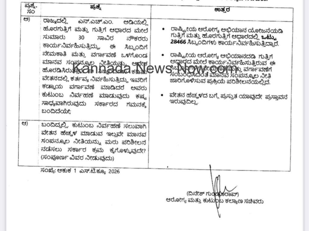 ಬೆಂಗಳೂರು: ರಾಜ್ಯದ ರಾಷ್ಟ್ರೀಯ ಆರೋಗ್ಯ ಅಭಿಯಾನದ (NHM) ಅಡಿಯಲ್ಲಿ ಕಾರ್ಯನಿರ್ವಹಿಸುತ್ತಿರುವ ಸಾವಿರಾರು ಗುತ್ತಿಗೆ ಮತ್ತು ಹೊರಗುತ್ತಿಗೆ ನೌಕರರ ದಶಕಗಳ ಬೇಡಿಕೆಗೆ ಸಂಬಂಧಿಸಿದಂತೆ ಸರ್ಕಾರ ಮಹತ್ವದ ಮಾಹಿತಿ ನೀಡಿದೆ. ನೌಕರರ ನೇಮಕಾತಿ ಮತ್ತು ವರ್ಗಾವಣೆಗೆ ಸಂಬಂಧಿಸಿದಂತೆ ಹೊಸ ‘ಮಾನವ ಸಂಪನ್ಮೂಲ ನೀತಿ’ (HR Policy) ಜಾರಿಗೊಳಿಸುವ ಪ್ರಕ್ರಿಯೆ ಪ್ರಸ್ತುತ ಪರಿಶೀಲನೆಯಲ್ಲಿದೆ ಎಂದು ಆರೋಗ್ಯ ಮತ್ತು ಕುಟುಂಬ ಕಲ್ಯಾಣ ಸಚಿವರಾದ ದಿನೇಶ್ ಗುಂಡೂರಾವ್ ತಿಳಿಸಿದ್ದಾರೆ.