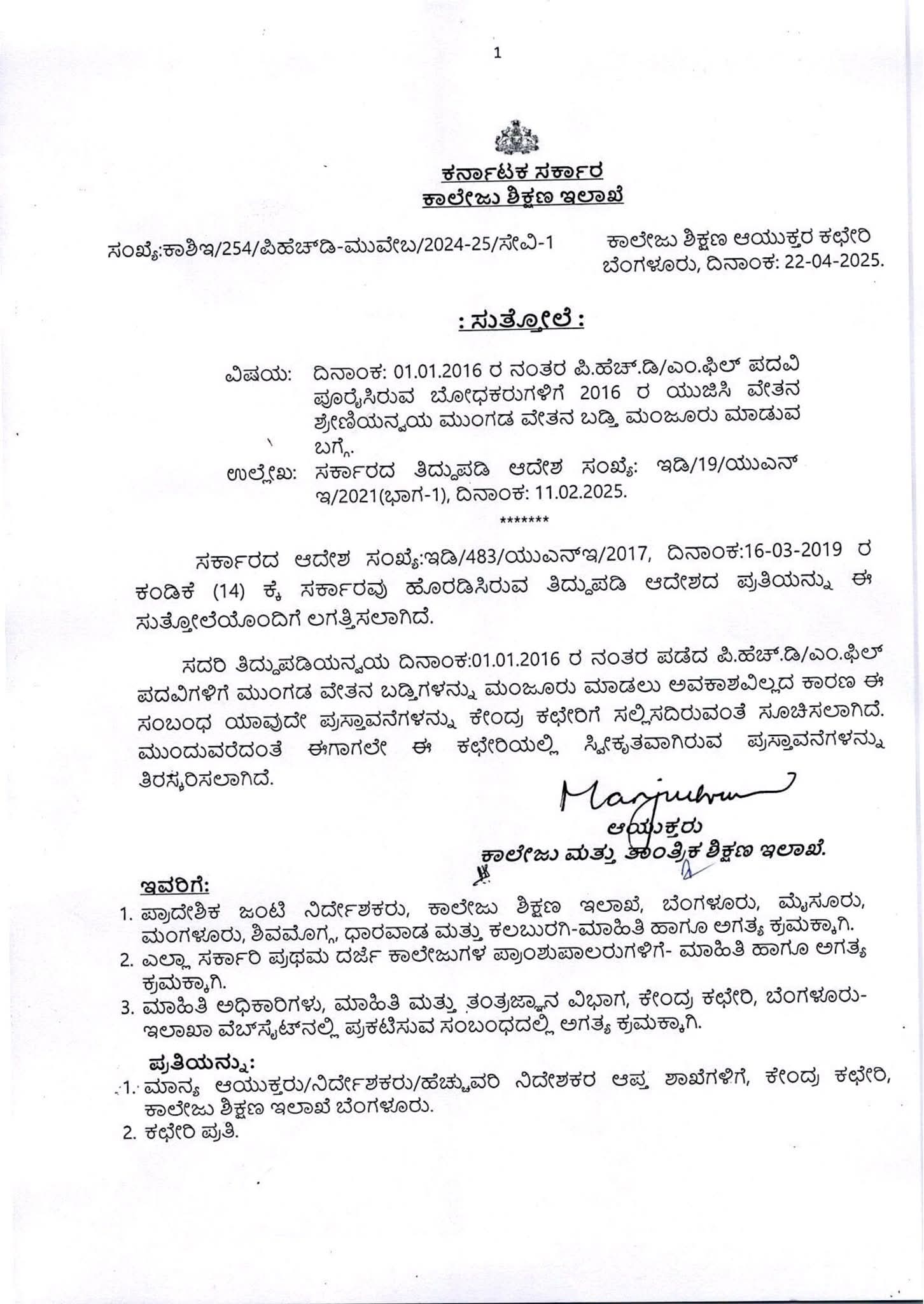 ಸದರಿ ತಿದ್ದುಪಡಿಯನ್ವಯ ದಿನಾಂಕ:01.01.2016 ರ ನಂತರ ಪಡೆದ ಪಿ.ಹೆಚ್.ಡಿ/ಎಂ.ಫಿಲ್ ಪದವಿಗಳಿಗೆ ಮುಂಗಡ ವೇತನ ಬಡ್ತಿಗಳನ್ನು ಮಂಜೂರು ಮಾಡಲು ಅವಕಾಶವಿಲ್ಲದ ಕಾರಣ ಈ ಸಂಬಂಧ ಯಾವುದೇ ಪ್ರಸ್ತಾವನೆಗಳನ್ನು ಕೇಂದ್ರ ಕಛೇರಿಗೆ ಸಲ್ಲಿಸದಿರುವಂತೆ ಸೂಚಿಸಲಾಗಿದೆ. ಮುಂದುವರೆದಂತೆ ಈಗಾಗಲೇ ಈ ಕಛೇರಿಯಲ್ಲಿ ಸ್ವೀಕೃತವಾಗಿರುವ ಪ್ರಸ್ತಾವನೆಗಳನ್ನು ತಿರಸ್ಕರಿಸಲಾಗಿದೆ ಎಂಬುದಾಗಿ ತಿಳಿಸಿ, ಬಿಗ್ ಶಾಕ್ ನೀಡಿದೆ.