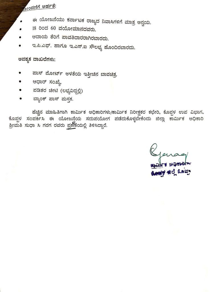 ಹೆಚ್ಚಿನ ಮಾಹಿತಿಗಾಗಿ ಮತ್ತು ನೋಂದಣಿಗಾಗಿ ಕಾರ್ಮಿಕ ಅಧಿಕಾರಿಗಳು ಅಥವಾ ಕಾರ್ಮಿಕ ನಿರೀಕ್ಷಕರ ಕಚೇರಿ, ಕೊಪ್ಪಳ ಉಪವಿಭಾಗ, ಕೊಪ್ಪಳ ಇವರನ್ನು ಸಂಪರ್ಕಿಸಲು ಕೋರಲಾಗಿದೆ. ಅರ್ಹ ಕಾರ್ಮಿಕರು ಈ ಯೋಜನೆಯ ಸದುಪಯೋಗ ಪಡಿಸಿಕೊಳ್ಳಬೇಕೆಂದು ಪ್ರಕಟಣೆಯಲ್ಲಿ ತಿಳಿಸಲಾಗಿದೆ.