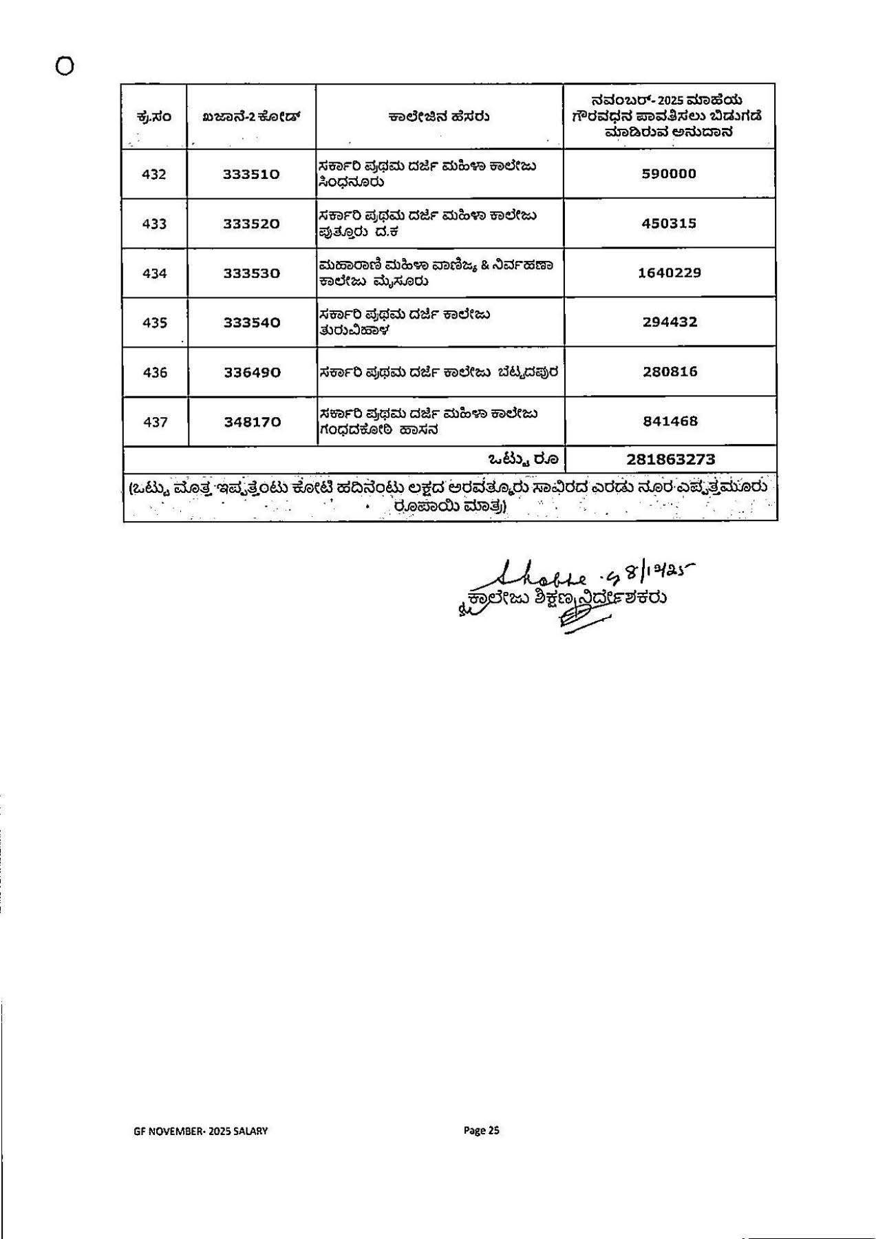 ಇಲಾಖಾ ವ್ಯಾಪ್ತಿಯ ಸರ್ಕಾರಿ ಪ್ರಥಮ ದರ್ಜೆ ಕಾಲೇಜುಗಳಲ್ಲಿ ಕರ್ತವ್ಯ ನಿರ್ವಹಿಸುತ್ತಿರುವ ಅತಿಥಿ ಉಪನ್ಯಾಸಕರುಗಳಿಗೆ ಗೌರವಧನ ಪಾವತಿಸಲು ಲೆ ಶೀ 2202-03-103-2-01 ಸರ್ಕಾರಿ ಪ್ರಥಮ ದರ್ಜೆ ಕಾಲೇಜುಗಳು ಉಪ ಲೆಕ್ಕ ಶೀರ್ಷಿಕೆ ‘324’ ಅತಿಥಿ ಉಪನ್ಯಾಸಕರ ಗೌರವಧನ ರಡಿಯಲ್ಲಿ ನವಂಬರ್- 2025 ರ ಮಾಹೆಯ ಗೌರವಧನ ಪಾವತಿಸಲು ಒಟ್ಟು ರೂ.28,18,63,273/- (ಇಪ್ಪತ್ತೆಂಟು ಕೋಟಿ ಹದಿನೆಂಟು ಲಕ್ಷದ ಅರವತ್ತೂರು ಸಾವಿರದ ಎರಡು ನೂರ ಎಪ್ಪತ್ತಮೂರು ಮಾತ್ರ) ಗಳನ್ನು ಆದೇಶಕ್ಕೆ ಲಗತ್ತಿಸಿರುವ ಅನುಬಂಧದಲ್ಲಿರುವ ವಿವರಗಳಂತೆ ಸಂಬಂಧಪಟ್ಟ ಪ್ರಾಂಶುಪಾಲರುಗಳಿಗೆ ಬಿಡುಗಡೆ ಮಾಡಿ ನಿಯಮಾನುಸಾರ ಬಳಕೆ ಮಾಡಲು ಅನುಮತಿ ನೀಡಲಾಗಿದೆ.
