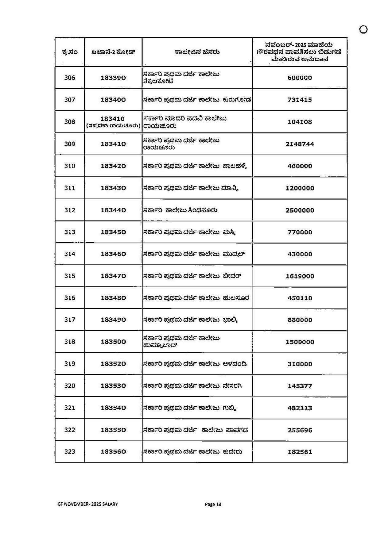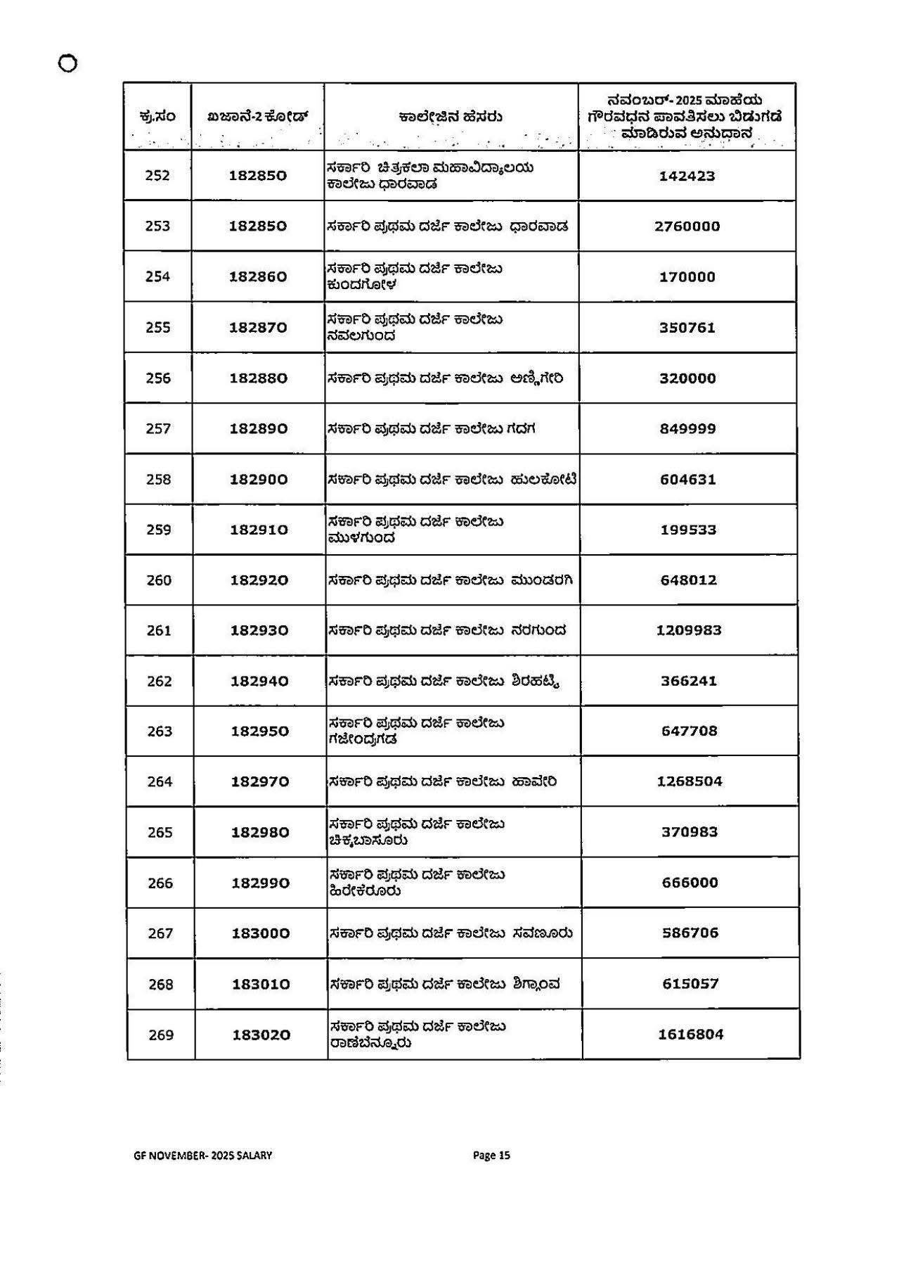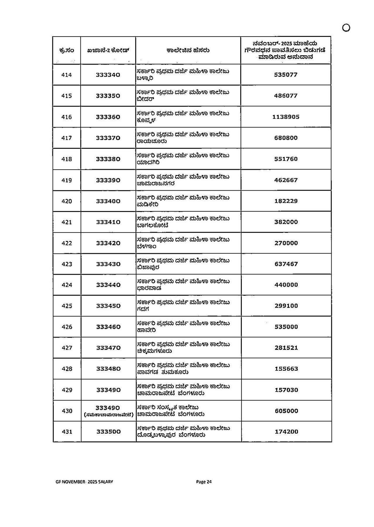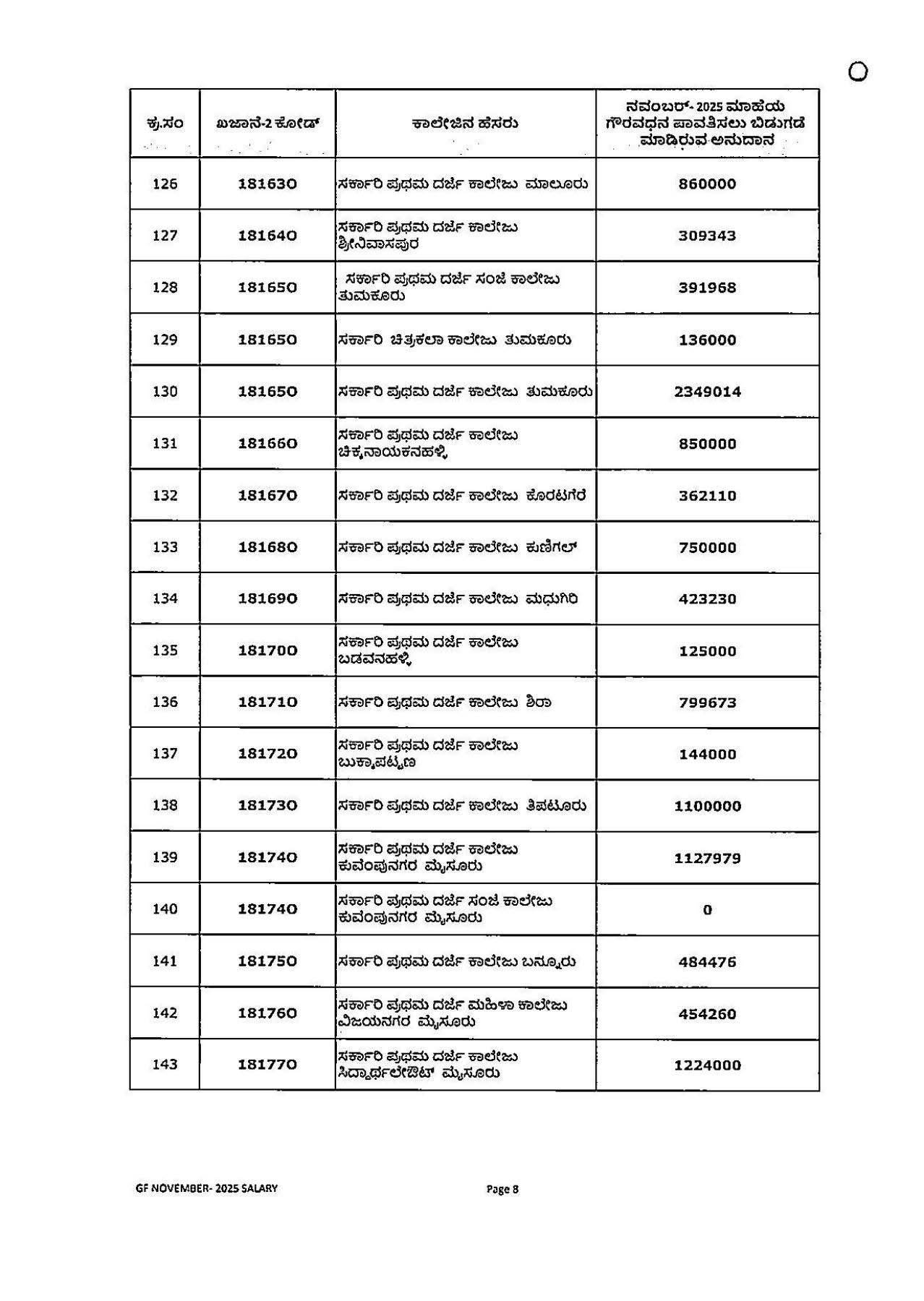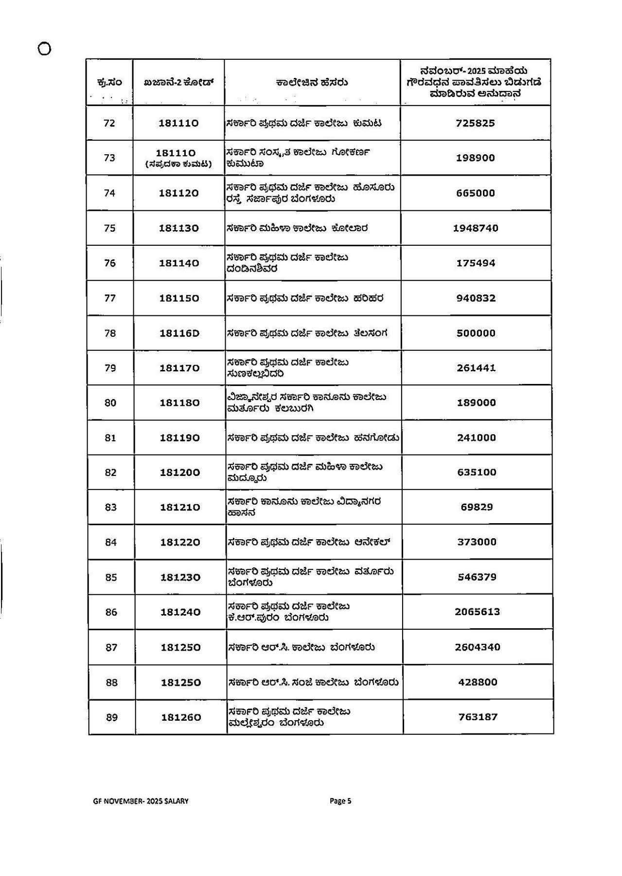 ಇಲಾಖಾ ವ್ಯಾಪ್ತಿಯ ಸರ್ಕಾರಿ ಪ್ರಥಮ ದರ್ಜೆ ಕಾಲೇಜುಗಳಲ್ಲಿ ಕರ್ತವ್ಯ ನಿರ್ವಹಿಸುತ್ತಿರುವ ಅತಿಥಿ ಉಪನ್ಯಾಸಕರುಗಳಿಗೆ ನವಂಬರ್- 2025 ರ ಮಾಹೆಯ ಗೌರವಧನ ಪಾವತಿಸಲು ಅಗತ್ಯ ಇರುವ ಅನುದಾನಕ್ಕಾಗಿ ಬೇಡಿಕೆ ಸಲ್ಲಿಸಲು ಇಲಾಖಾ ವ್ಯಾಪ್ತಿಯ ಎಲ್ಲಾ ಸರ್ಕಾರಿ ಪದವಿ ಕಾಲೇಜುಗಳ ಪ್ರಾಂಶುಪಾಲರುಗಳಿಗೆ ಸೂಚಿಸಲಾಗಿತ್ತು. 436 ಸರ್ಕಾರಿ ಪ್ರಥಮ ದರ್ಜೆ ಕಾಲೇಜುಗಳ ಪ್ರಾಂಶುಪಾಲರುಗಳು ಅನುದಾನಕ್ಕಾಗಿ ಬೇಡಿಕೆ ಸಲ್ಲಿಸಿದ್ದು, ಅದರಂತೆ ಅನುದಾನ ಬಿಡುಗಡೆ ಮಾಡಲು ಈ ಆದೇಶ.