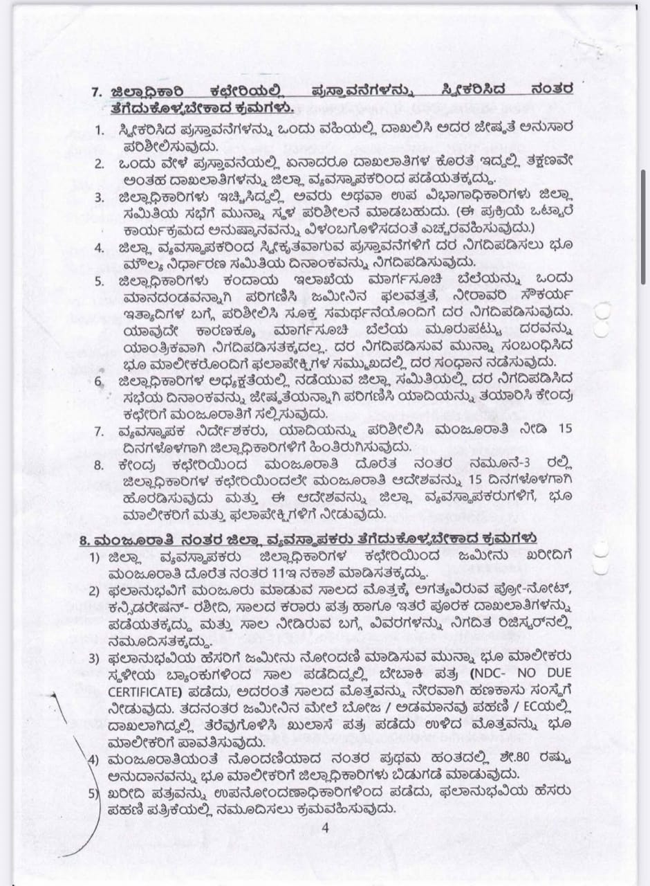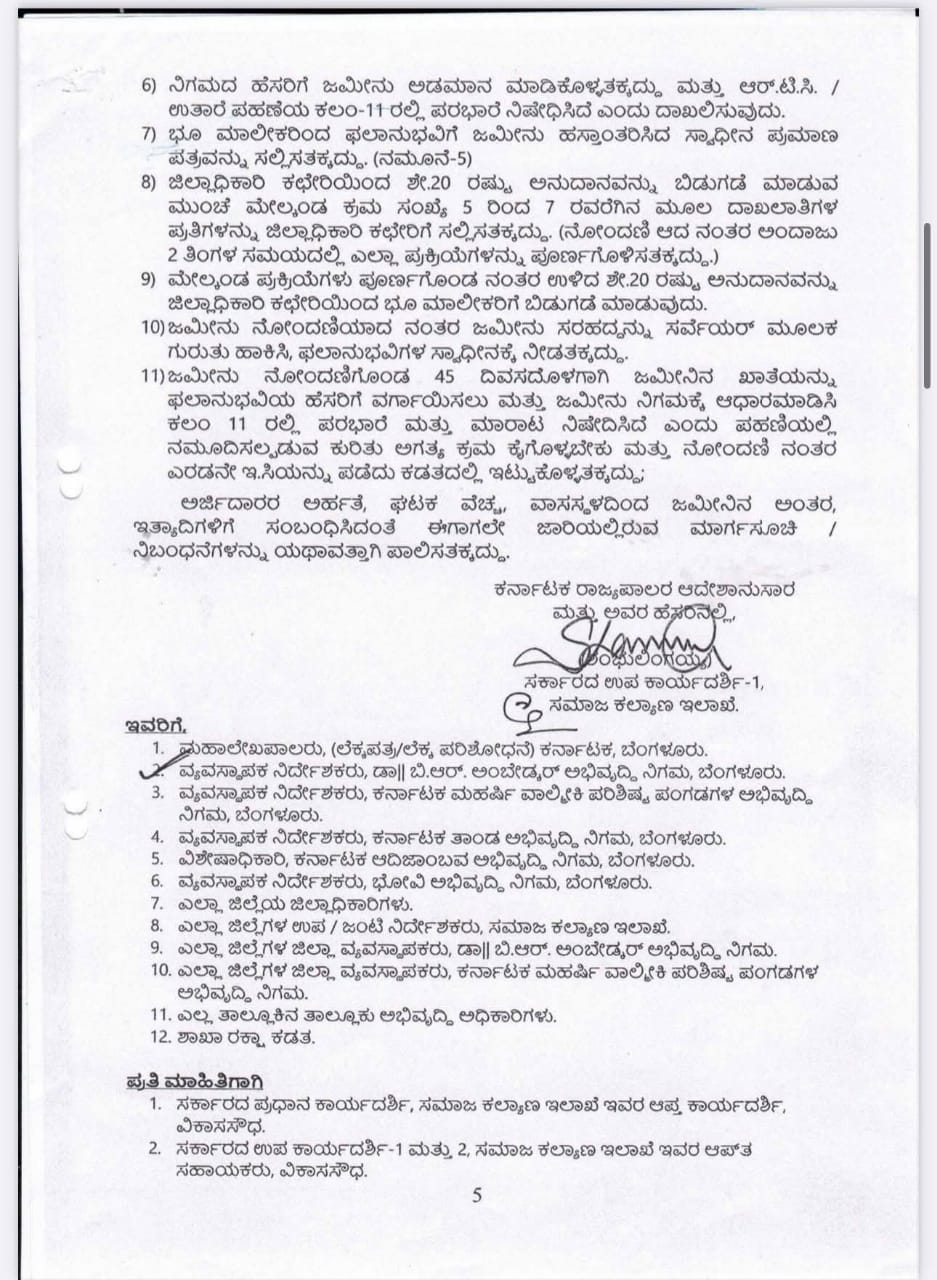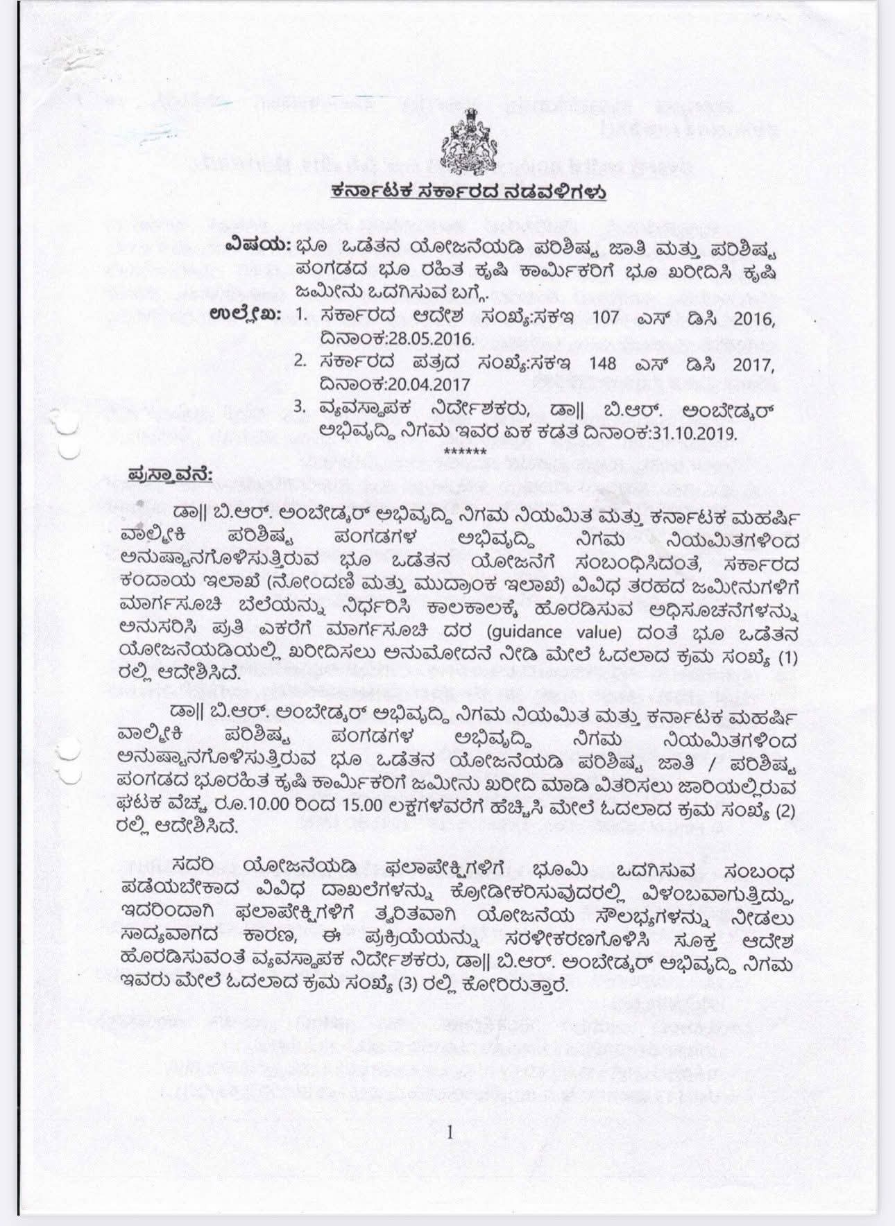 ಡಾ|| ಬಿ.ಆರ್. ಅಂಬೇಡ್ಕರ್ ಅಭಿವೃದ್ಧಿ ನಿಗಮ ನಿಯಮಿತ ಮತ್ತು ಕರ್ನಾಟಕ ಮಹರ್ಷಿ ವಾಲ್ಮೀಕಿ ಪರಿಶಿಷ್ಟ ಪಂಗಡಗಳ ಅಭಿವೃದ್ಧಿ ನಿಗಮ ನಿಯಮಿತಗಳಿಂದ ಅನುಷ್ಠಾನಗೊಳಿಸುತ್ತಿರುವ ಭೂ ಒಡೆತನ ಯೋಜನೆಗೆ ಸಂಬಂಧಿಸಿದಂತೆ, ಸರ್ಕಾರದ ಕಂದಾಯ ಇಲಾಖೆ (ನೋಂದಣಿ ಮತ್ತು ಮುದ್ರಾಂಕ ಇಲಾಖೆ) ವಿವಿಧ ತರಹದ ಜಮೀನುಗಳಿಗೆ ಮಾರ್ಗಸೂಚಿ ಬೆಲೆಯನ್ನು ನಿರ್ಧರಿಸಿ ಕಾಲಕಾಲಕ್ಕೆ ಹೊರಡಿಸುವ ಅಧಿಸೂಚನೆಗಳನ್ನು ಅನುಸರಿಸಿ ಪ್ರತಿ ಎಕರೆಗೆ ಮಾರ್ಗಸೂಚಿ ದರ (guidance value) ದಂತೆ ಭೂ ಒಡೆತನ ಯೋಜನೆಯಡಿಯಲ್ಲಿ ಖರೀದಿಸಲು ಅನುಮೋದನೆ ನೀಡಿ ಮೇಲೆ ಓದಲಾದ ಕ್ರಮ ಸಂಖ್ಯೆ (1) ರಲ್ಲಿ ಆದೇಶಿಸಿದೆ.
