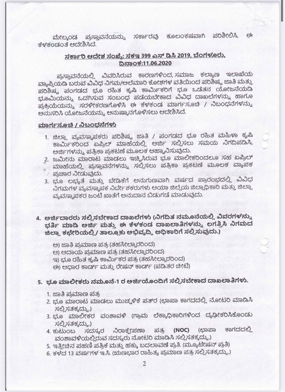 ಬೆಂಗಳೂರು : ಭೂ ಒಡೆತನ ಯೋಜನೆಯಡಿ ಪರಿಶಿಷ್ಟ ಜಾತಿ ಮತ್ತು ಪರಿಶಿಷ್ಟ ಪಂಗಡದ ಭೂ ರಹಿತ ಕೃಷಿ ಕಾರ್ಮಿಕರಿಗೆ ಭೂ ಖರೀದಿಸಿ ಕೃಷಿ ಜಮೀನು ಒದಗಿಸುವ ಬಗ್ಗೆ ರಾಜ್ಯ ಸರ್ಕಾರ ಮಹತ್ವದ ಆದೇಶ ಹೊರಡಿಸಿದೆ.