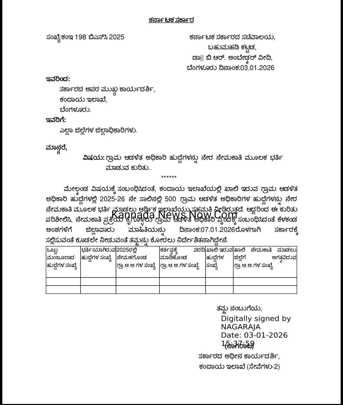 ಆದ್ದರಿಂದ ಈ ಕುರಿತು ಪರಿಶೀಲಿಸಿ, ನೇಮಕಾತಿ ಪ್ರಕ್ರಿಯೆ ಕೈಗೊಳ್ಳಲು ಗ್ರಾಮ ಆಡಳಿತ ಅಧಿಕಾರಿ ವೃಂದಕ್ಕೆ ಸಂಬಂಧಿಸಿದಂತೆ ಕೆಳಕಂಡ ಅಂಶಗಳಿಗೆ ಜಿಲ್ಲಾವಾರು ಮಾಹಿತಿಯನ್ನು ದಿನಾಂಕ :07.01.2026 ಸಲ್ಲಿಸುವಂತೆ ಕೋರಲು ನಿರ್ದೇಶಿಸಲಾಗಿದೆ.