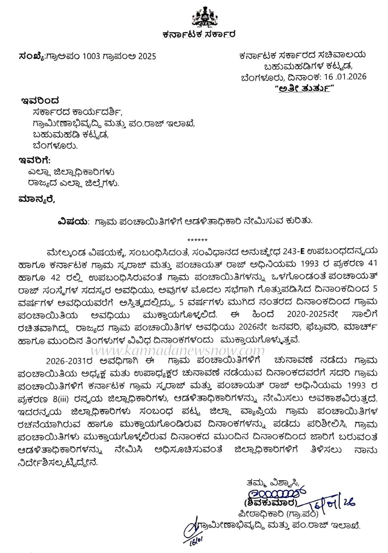 2026-2031ರ ಅವಧಿಗಾಗಿ ಈ ಗ್ರಾಮ ಪಂಚಾಯಿತಿಗಳಿಗೆ ಚುನಾವಣೆ ನಡೆದು ಗ್ರಾಮ ಪಂಚಾಯಿತಿಯ ಅಧ್ಯಕ್ಷ ಮತ್ತು ಉಪಾಧ್ಯಕ್ಷರ ಚುನಾವಣೆ ನಡೆಯುವ ದಿನಾಂಕದವರೆಗೆ ಸದರಿ ಗ್ರಾಮ ಪಂಚಾಯಿತಿಗಳಿಗೆ ಕರ್ನಾಟಕ ಗ್ರಾಮ ಸ್ವರಾಜ್ ಮತ್ತು ಪಂಚಾಯತ್ ರಾಜ್ ಅಧಿನಿಯಮ 1993 ರ ಪ್ರಕರಣ 8(iii) ರನ್ವಯ ಜಿಲ್ಲಾಧಿಕಾರಿಗಳು, ಆಡಳಿತಾಧಿಕಾರಿಗಳನ್ನು ನೇಮಿಸಲು ಅವಕಾಶವಿರುತ್ತದೆ. ಇದರನ್ವಯ ಜಿಲ್ಲಾಧಿಕಾರಿಗಳು ಸಂಬಂಧ ಪಟ್ಟ ಜಿಲ್ಲಾ ವ್ಯಾಪ್ತಿಯ ಗ್ರಾಮ ಪಂಚಾಯಿತಿಗಳ ರಚನೆಯಾಗಿರುವ ಹಾಗೂ ಮುಕ್ತಾಯಗೊಂಡಿರುವ ದಿನಾಂಕಗಳನ್ನು ಪಡೆದು ಪರಿಶೀಲಿಸಿ, ಗ್ರಾಮ ಪಂಚಾಯಿತಿಗಳು ಮುಕ್ತಾಯಗೊಳ್ಳಲಿರುವ ದಿನಾಂಕದ ಮುಂದಿನ ದಿನಾಂಕದಿಂದ ಜಾರಿಗೆ ಬರುವಂತ ಆಡಳಿತಾಧಿಕಾರಿಗಳನ್ನು ನೇಮಿಸಿ ಅಧಿಸೂಚಿಸುವಂತೆ ಜಿಲ್ಲಾಧಿಕಾರಿಗಳಿಗೆ ತಿಳಿಸಲು ನಿರ್ದೇಶಿಸಲ್ಪಟ್ಟಿದ್ದೇನೆ ಎಂದಿದ್ದಾರೆ.